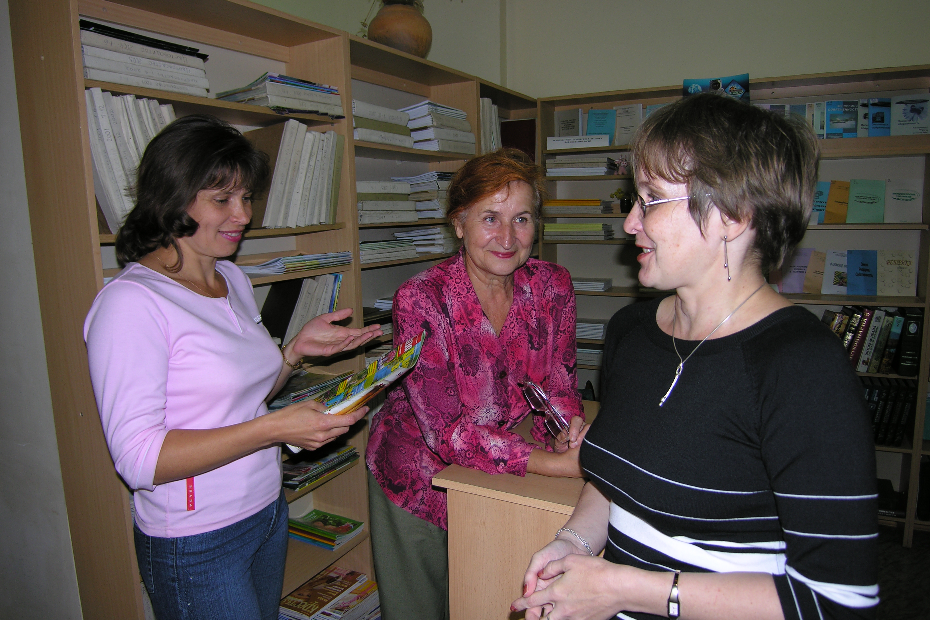 2004 г. Мобильный консультационный пункт в Областной администрации Орловской области. Слева-направо: Глава администрации Ново-Деревеньковского района С.Н. Медведев, директор библиотеки им. И.А. Бунина В.В. Бубнов, зав. отделом документов по экологии и сельскому хозяйству Е.А. Сухотина