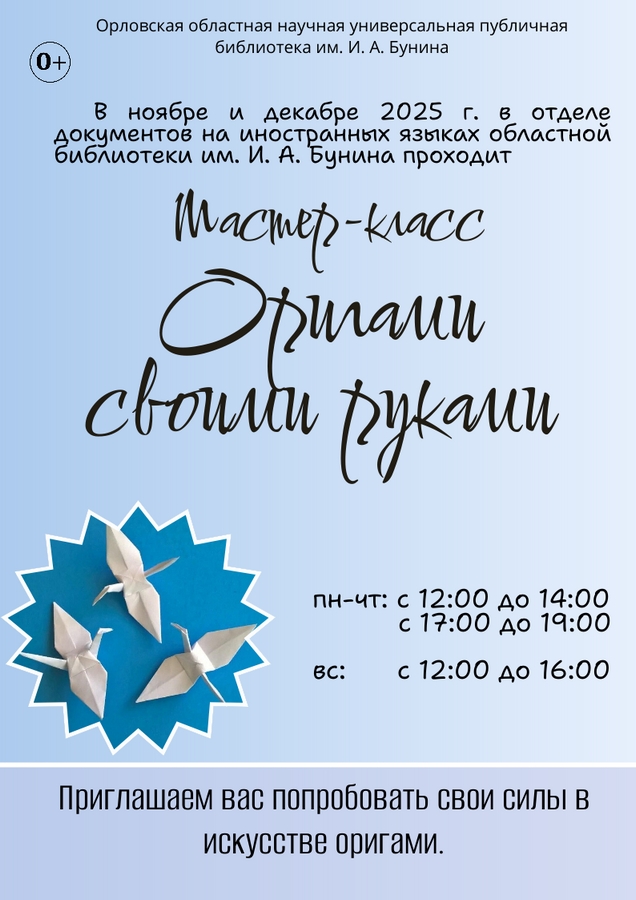 С 3 ноября по 28 декабря 2025 года в отделе документов на иностранных языках Орловской областной библиотеки им. И. А. Бунина проходит мастер-класс «Оригами своими руками».