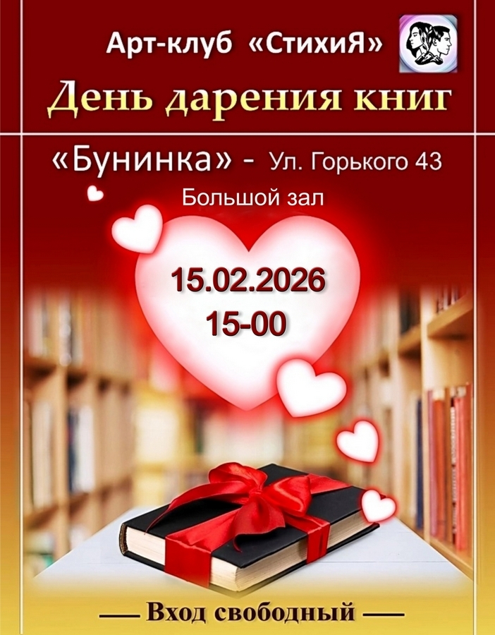 15 февраля в 15:00 в Орловской областной библиотеке им. И. А. Бунина пройдет встреча арт-клуба «СтихиЯ», посвященная Международному дню дарения книг.