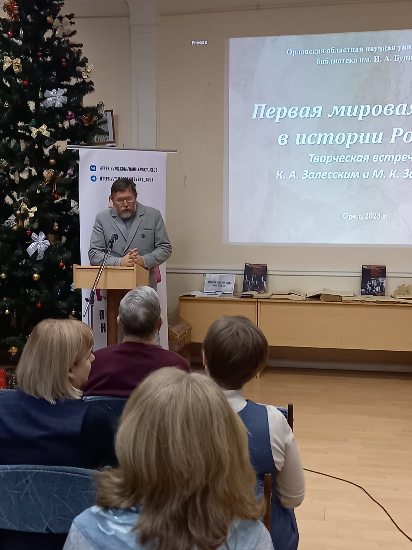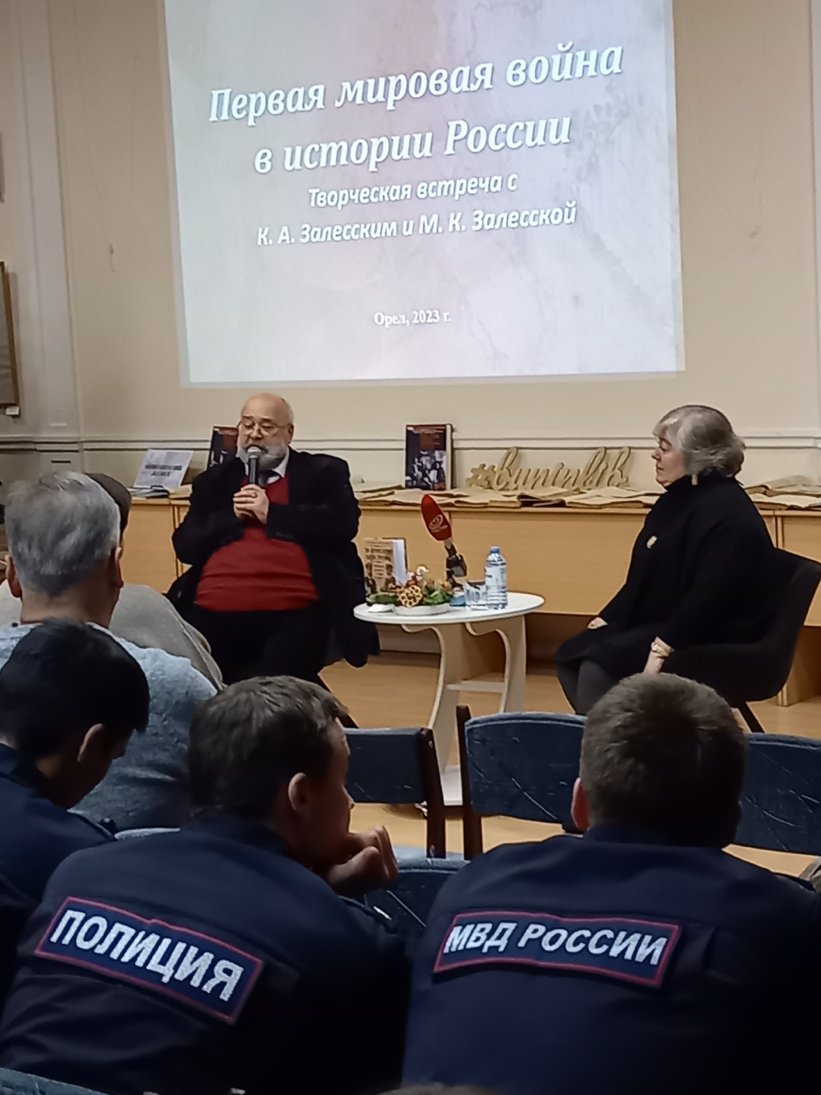 8 декабря 2023 года в библиотеке состоялась встреча с известным историком Первой и Второй мировых войн Константином Александровичем Залесским и главным редактором издательства «Молодая гвардия», писательницей-биографом Марией Кирилловной Залесской (г. Москва). Мероприятие являлось совместным проектом библиотеки, Данилевского клуба и Молодежного братства во имя св. Георгия Победоносца и проходило в рамках празднования Дня Героев Отечества.
