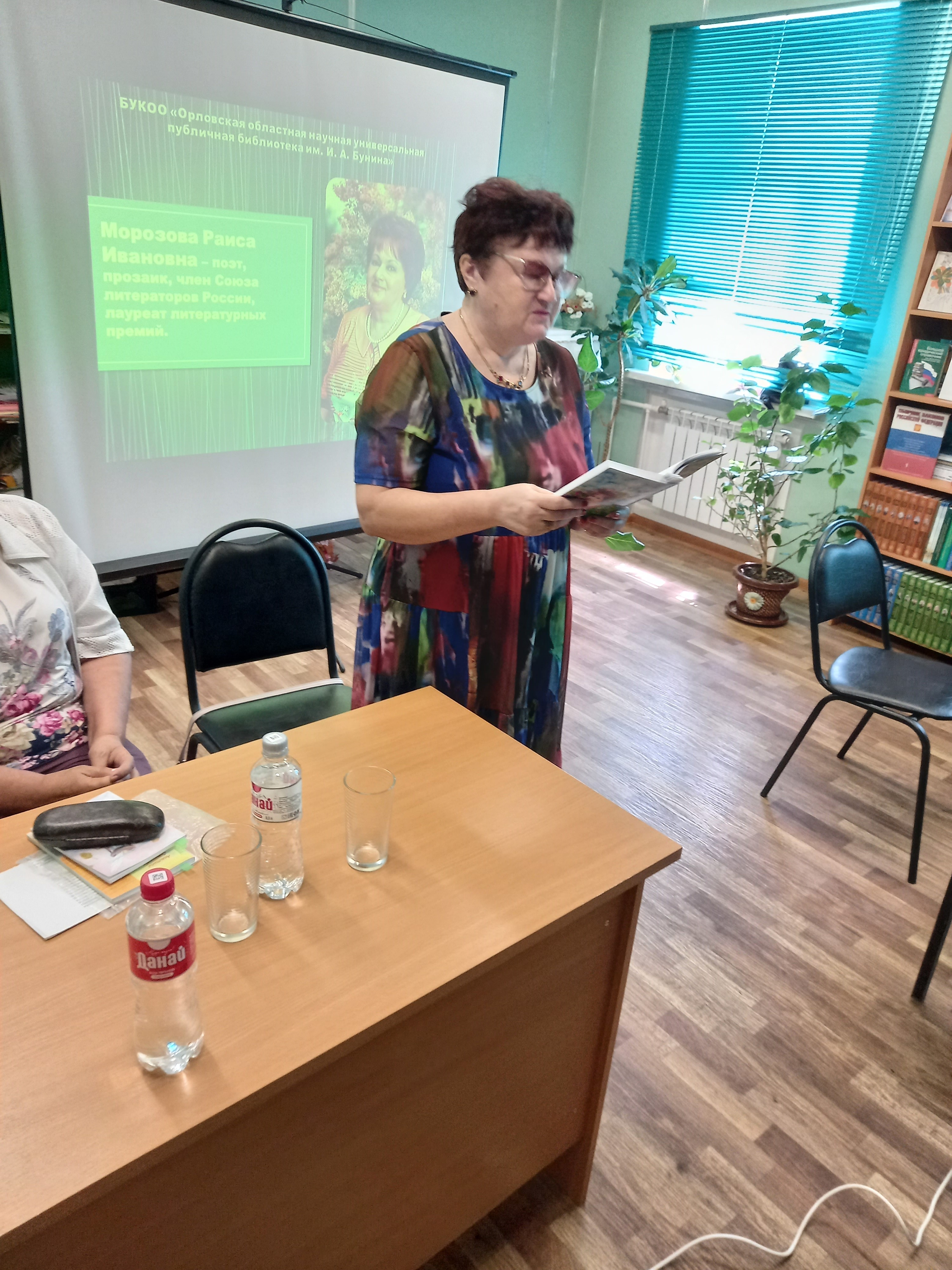 Перед собравшимися выступили: Антонина Семёновна Сытникова – поэт, прозаик, член орловского отделения Союза писателей России, лауреат многочисленных Всероссийских литературных конкурсов; Раиса Ивановна Морозова – поэт, прозаик, член Союза литераторов России, лауреат областных и Всероссийских литературных конкурсов. В авторском исполнении прозвучали стихи на разные темы.