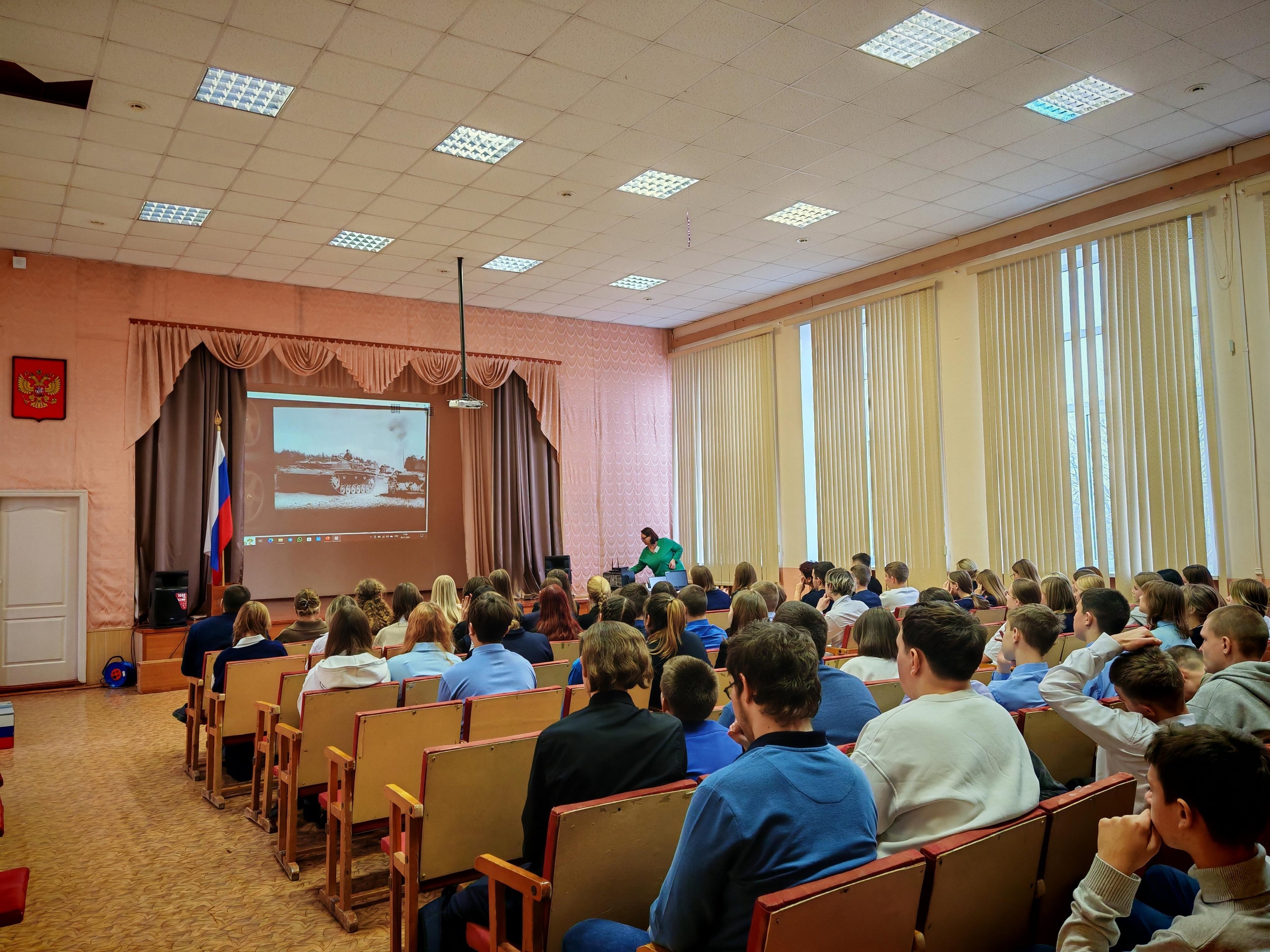 Перед показом с вступительным словом к учащимся обратилась руководитель проекта «Орел послевоенный: разговоры о важном», сотрудник Орловской областной библиотеки им. И.А. Бунина – Наталья Викторовна Ставцева.