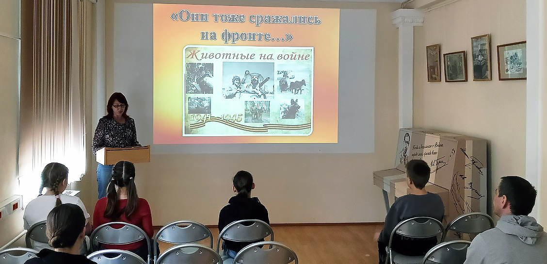 В ходе встречи дети узнали о том, что благодаря рассказам ветеранов и ранее засекреченным документам, есть свидетельства, которые приоткрывают тайну одного из удивительных фактов Великой Отечественной войны. Оказывается, в те тяжёлые годы рядом с солдатами на фронте сражались и те, кого мы называем нашими меньшими братьями — животные и птицы.