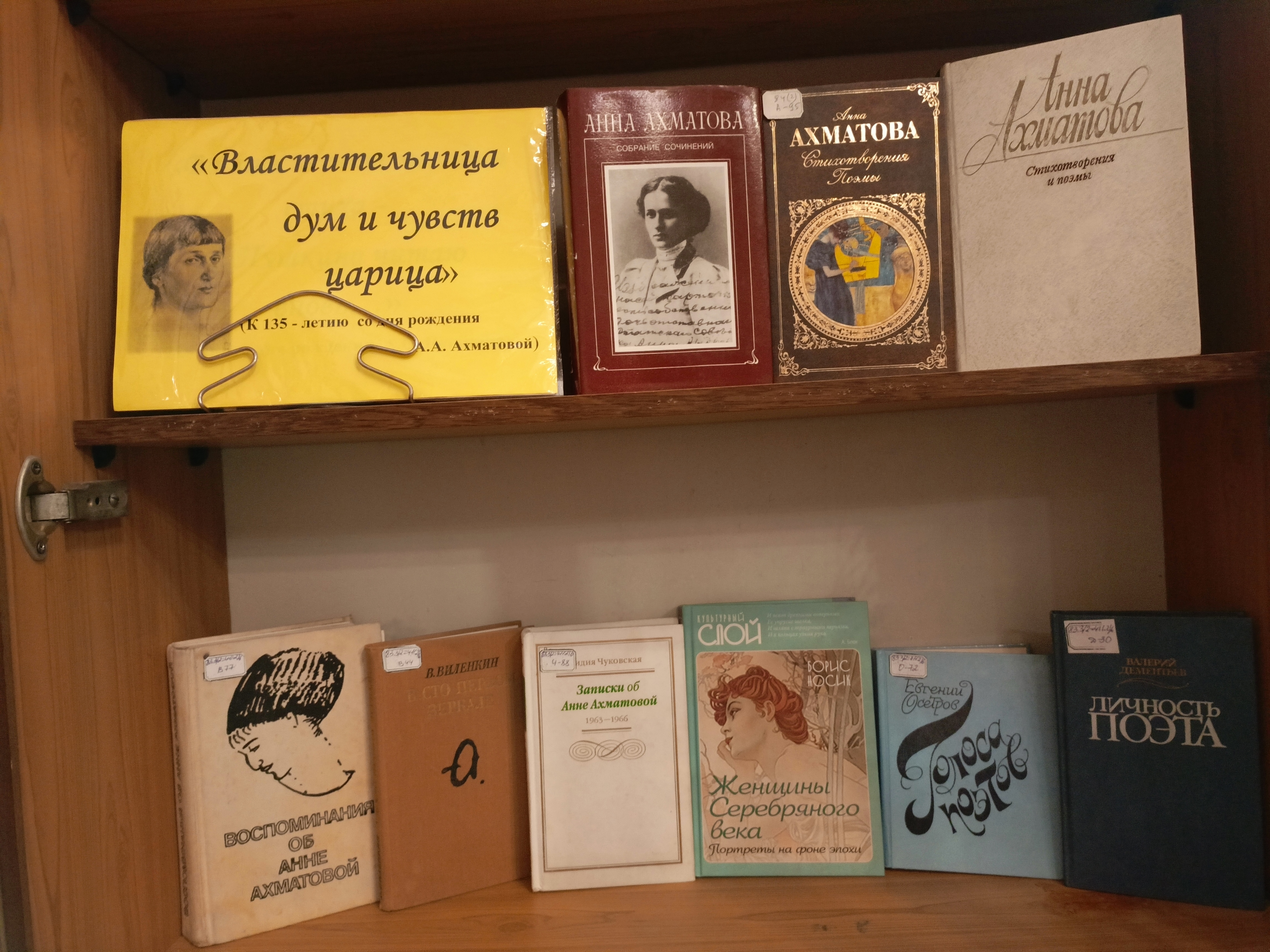 С 19 по 26 июня 2024 года в отделе абонемента образовательных услуг Орловской областной библиотека им. И. А. Бунина работает выставка «Властительница дум и чувств царица», посвященная 135-летию со дня рождения А. А. Ахматовой.