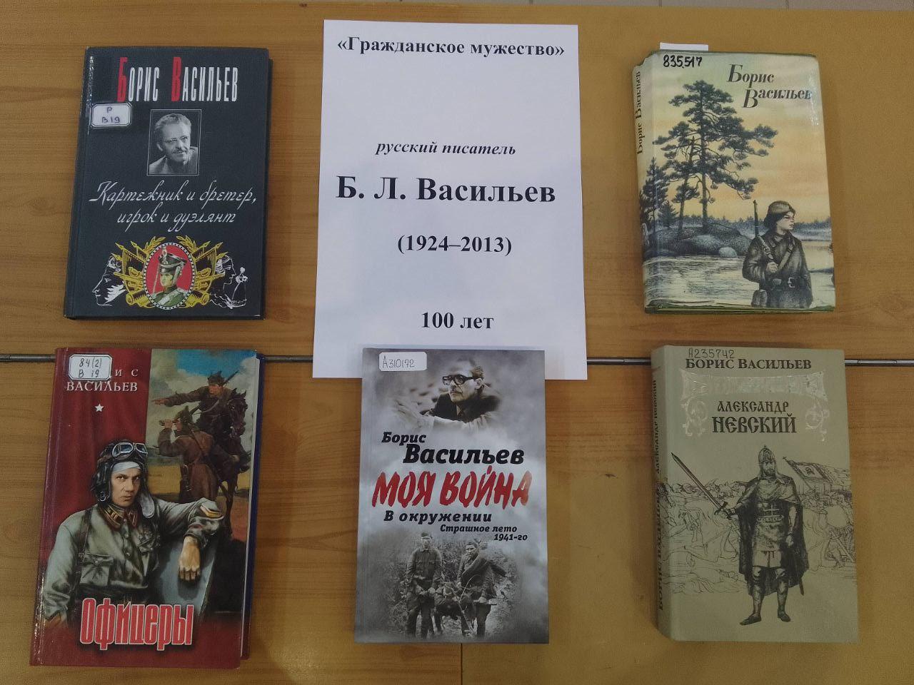 С 30 апреля по 31 мая 2024 года в читальном зале Орловской областной библиотеки им. И. А. Бунина работает выставка «Гражданское мужество», посвященная 100-летию со дня рождения писателя Бориса Львовича Васильева
