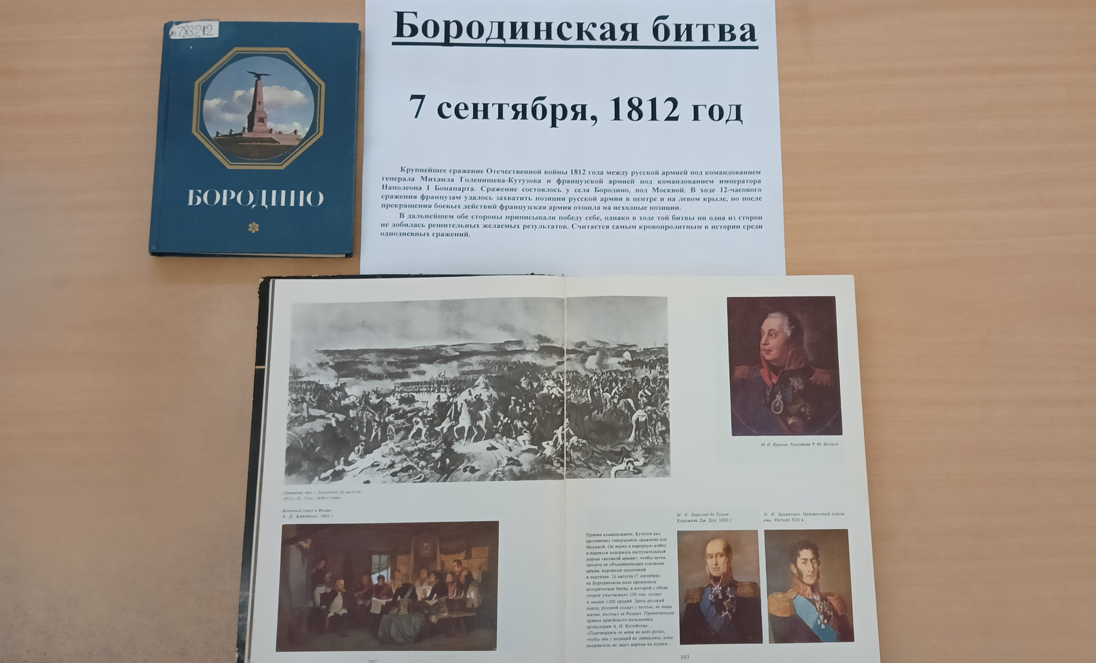 В экспозиции представлены книги, статьи, монографии и другие материалы, рассказывающие о Бородинской битве, её участниках и последствиях. Посетители смогут узнать больше о ходе сражения, его героях и значении для истории России.