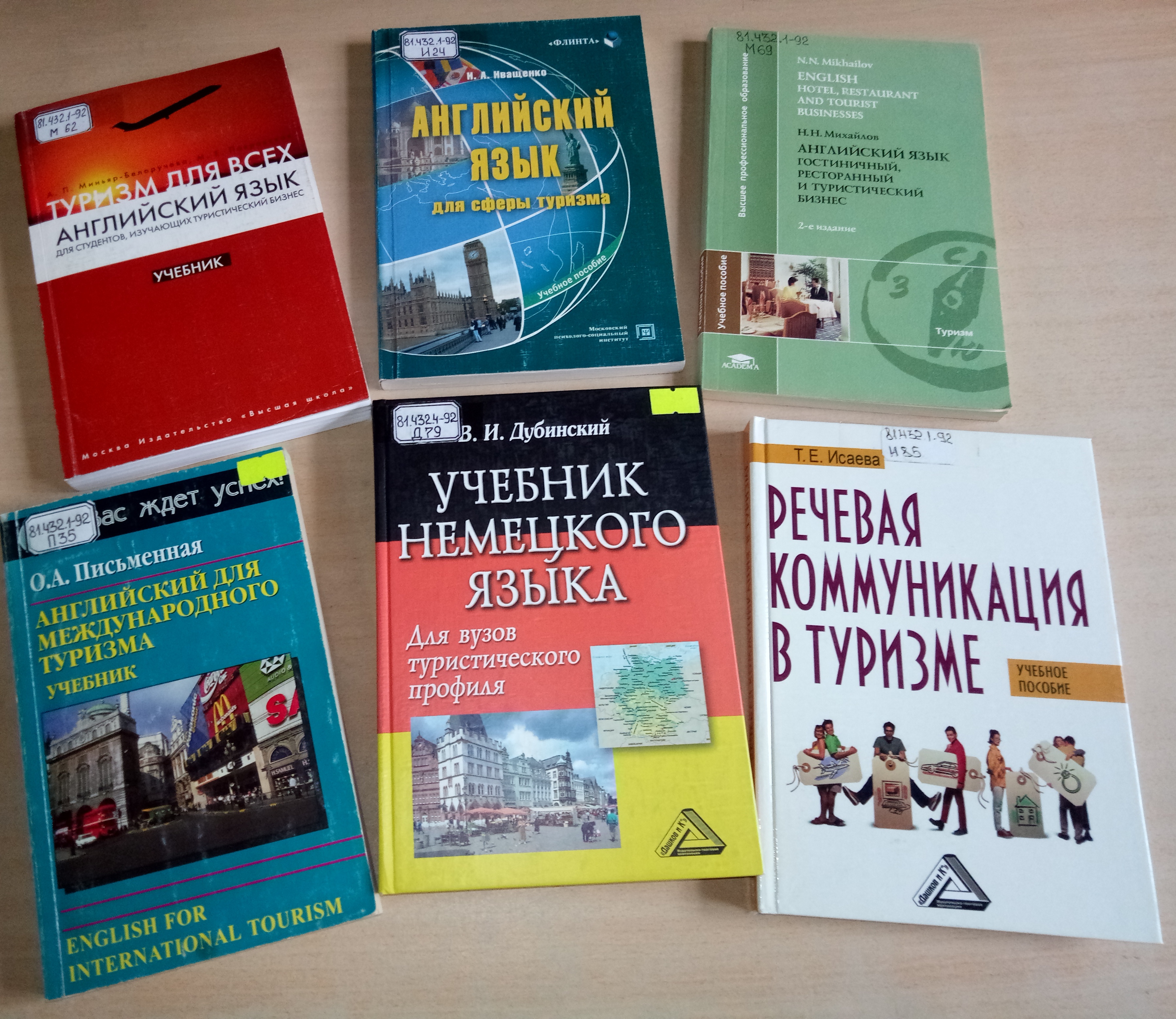 На выставке представлены путеводители на русском языке по разным странам, а также учебники английского и немецкого языка для вузов туристического профиля.