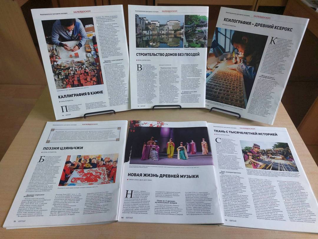 На выставке представлены выпуски журнала «Китай» с разнообразной информацией о нематериальном культурном наследии Китая.