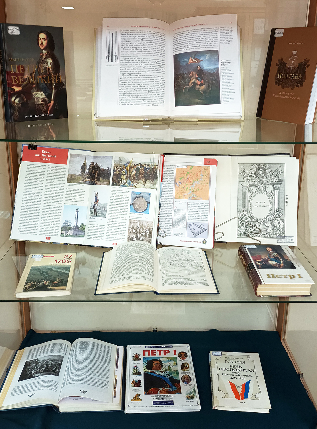 На экспозиции посвящённой этому важнейшему сражению, вы сможете увидеть энциклопедические издания, посвящённые Полтавской битве в целом и Петру I в частности, а также ознакомиться с книгами А. И. Злаина «Полтавская битва», С. Т. Минакова «Полтавское сражение 1709-2009», В. Артамонова «27 июня 1709», в которых во всех подробностях рассматривается ход боя. Среди изобразительных материалов выставки особый интерес вызывает репродукция мозаики великого русского учёного и художника М. В. Ломоносова, посвящённой Полтавской битве.