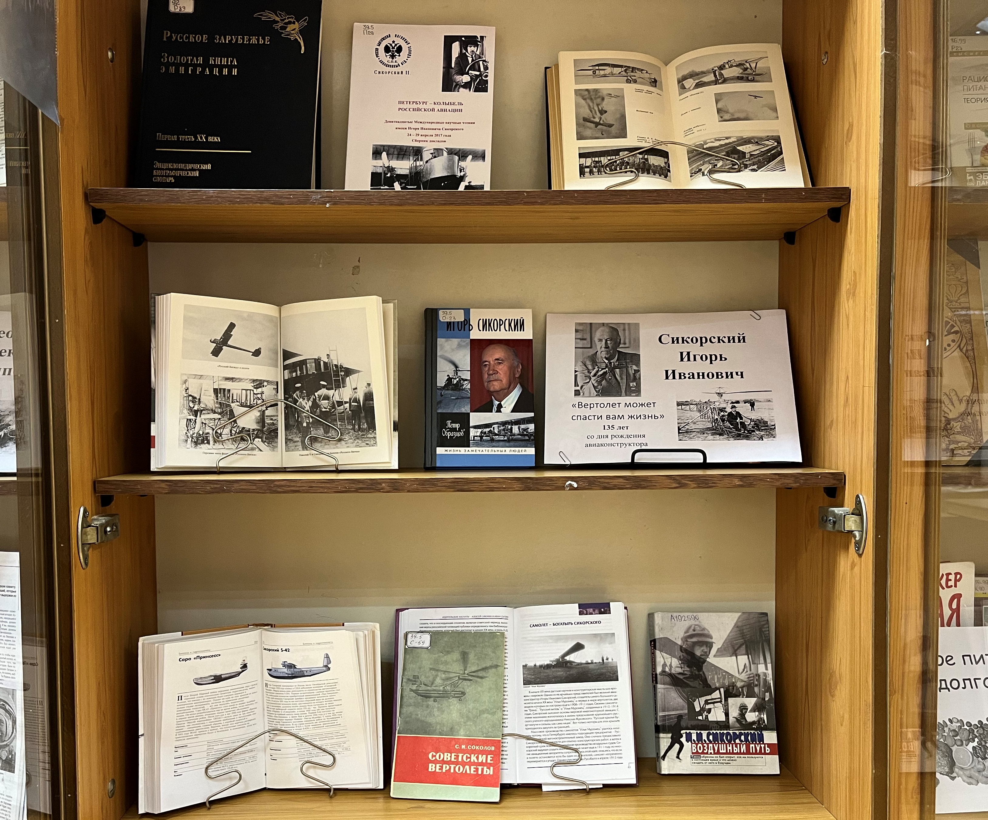 Выставка литературы «И. И. Сикорский. К 135-летию со дня рождения» открыта с 20 мая по 18 июня 2024 года в отделе производственной литературы Орловской областной библиотеки им. И. А Бунина. Книжная выставка проводится в рамках цикла «Покорители неба: знаменитые юбиляры».