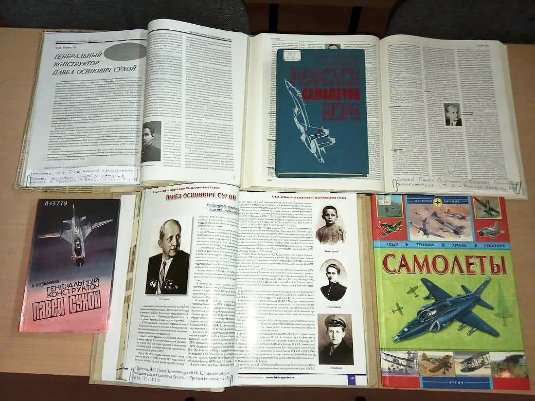 На выставке представлены книги «Генеральный конструктор Павел Сухой» Л. М. Кузьминой, «Авиация и космонавтика СССР», «Самолеты», «Самолеты Великой Отечественной войны» и др. Много интересной информации все желающие найдут в публикациях из журналов «Крылья Родины», «Наука и жизнь», «История науки и техники».