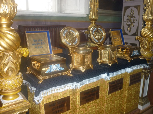 Некоторое время в церкви пребывали святые мощи святителя Тихона Задонского. В 1991 году открылся Задонский мужской монастырь, и мощи святого были возвращены туда. В память о пребывании их в Ахтырском соборе, кисть святителя Тихона, с давних времен хранившаяся отдельно, была оставлена в храме, где и почитается прихожанами одной из главных святынь. Для нее художником иконописцем А. И. Неверовым была написана икона святителя в рост и изготовлены ковчег для мощей и резной киот для иконы.