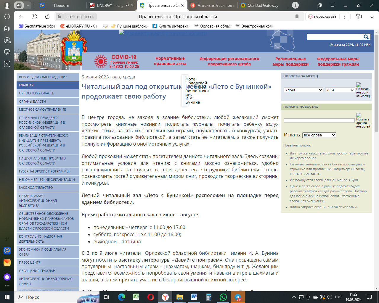 Читальный зал под открытым небом «Лето с Бунинкой» продолжает свою работу. – 05.07.2023. - Текст: электронный // Портал Правительства Орловской области [сайт].(дата обращения 26.06.2024). | |