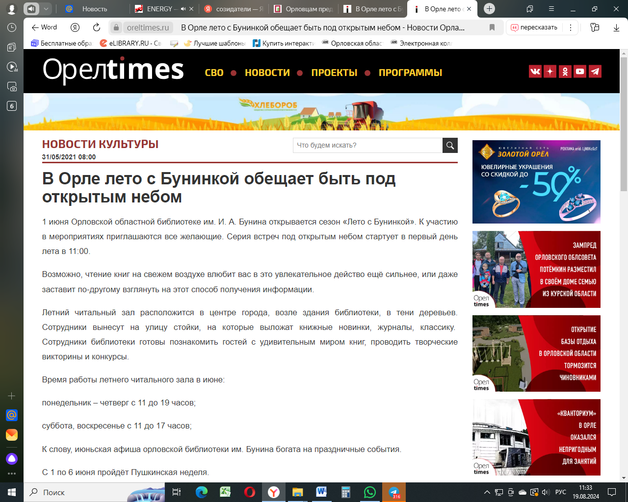 В Орле лето с Бунинкой обещает быть под открытым небом. – 31.05.2021. - Текст: электронный // Орёлтаймс [сайт]. (дата обращения 26.06.2024). | |