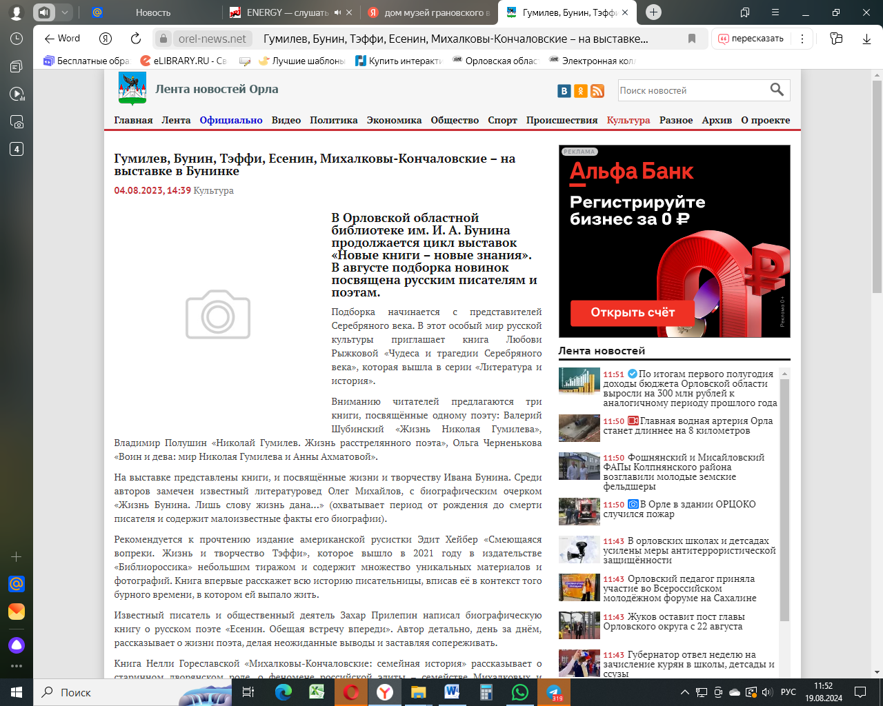 | Гумилев, Бунин, Тэффи, Есенин, Михалковы-Кончаловские – на выставке в Бунинке. – 04.08.2023. - Текст: электронный // Лента новостей Орла [сайт]. (дата обращения 26.06.2024). |