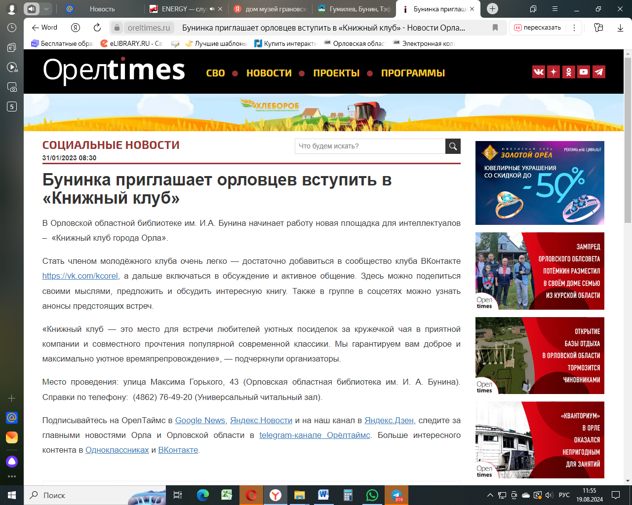 Бунинка приглашает орловцев вступить в «Книжный клуб». – 31.01.2023. Текст: электронный // ОрелТаймс [сайт]. (дата обращения 26.06.2024). | |