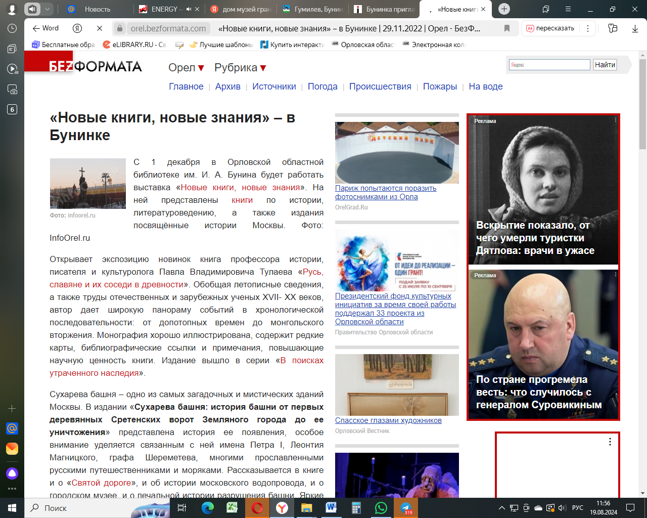 | «Новые книги, новые знания» – в Бунинке. – 29.11.2022. Текст: электронный // Орел.Безформата [сайт]. (дата обращения 26.06.2024). |