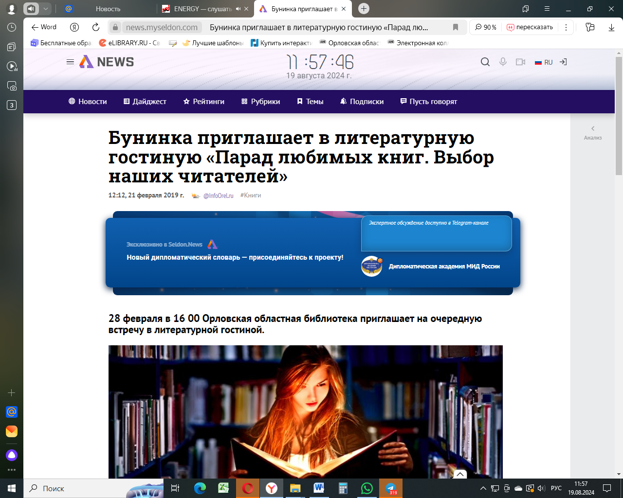 Бунинка приглашает в литературную гостиную «Парад любимых книг. Выбор наших читателей». – 21.02.2019. – Текст: электронный // ИА «ИнфоОрел» [сайт]. (дата обращения 26.06.2024). | |