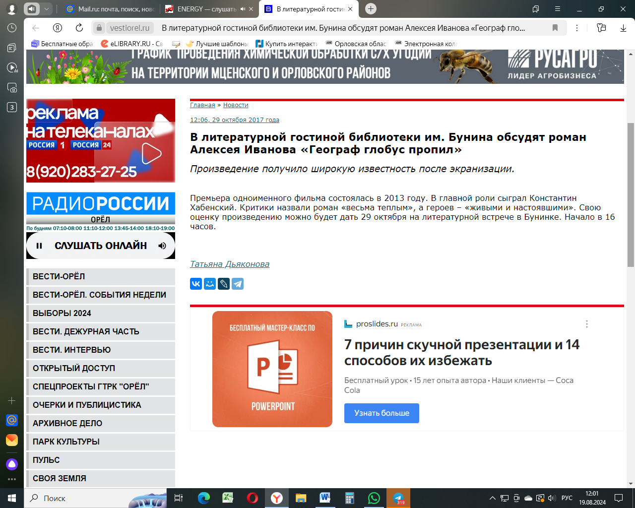 | Дьяконова, Т. В литературной гостиной библиотеки им. Бунина обсудят роман Алексея Иванова «Географ глобус пропил» / Татьяна Дьяконова. – 29.10.2017. - Текст: электронный // ГТРК-Орел [сайт]. (дата обращения 26.06.2024). |