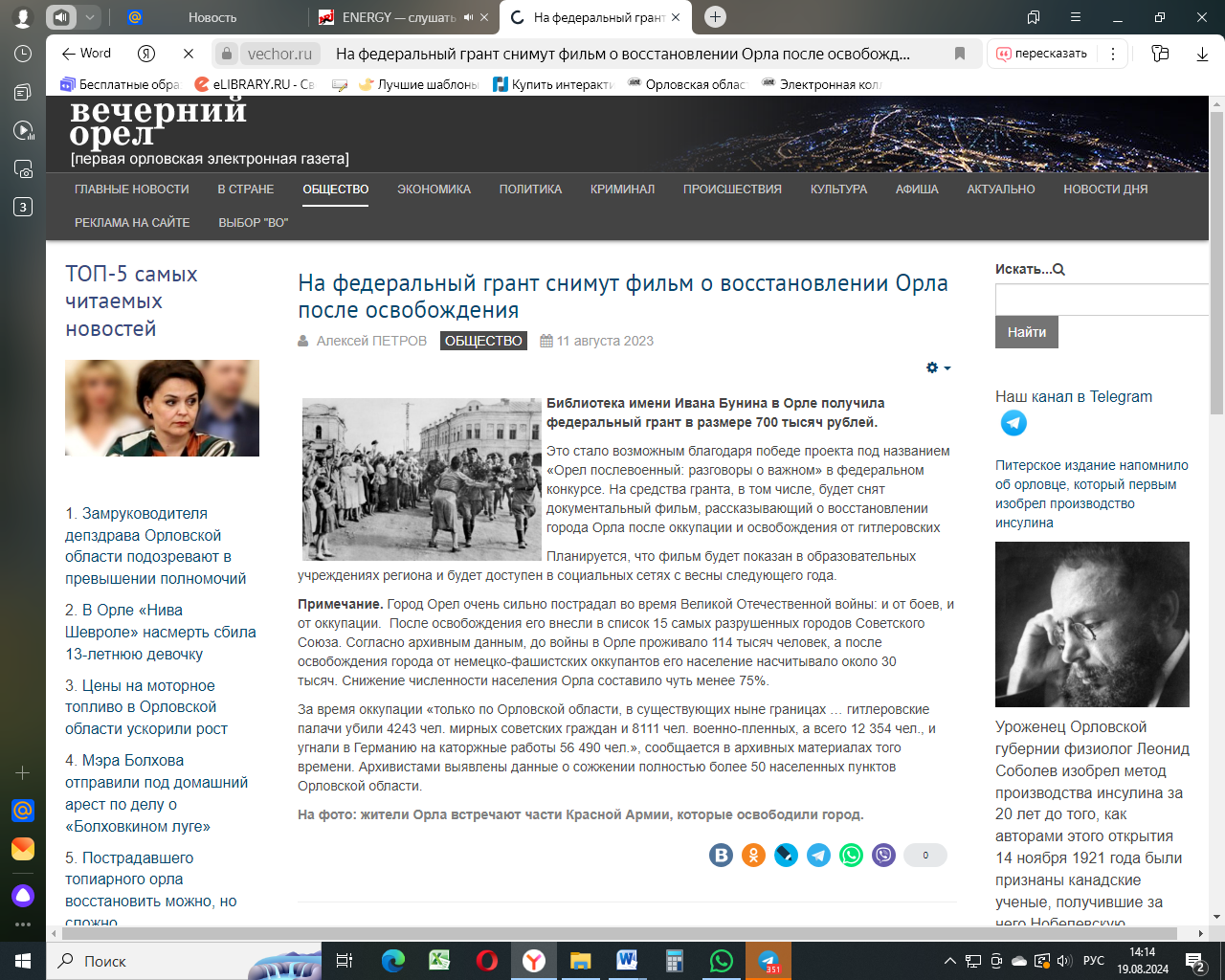 Петров, А. На федеральный грант снимут фильм о восстановлении Орла после освобождения / Алексей Петров. – 11.08.2023. Текст: электронный //