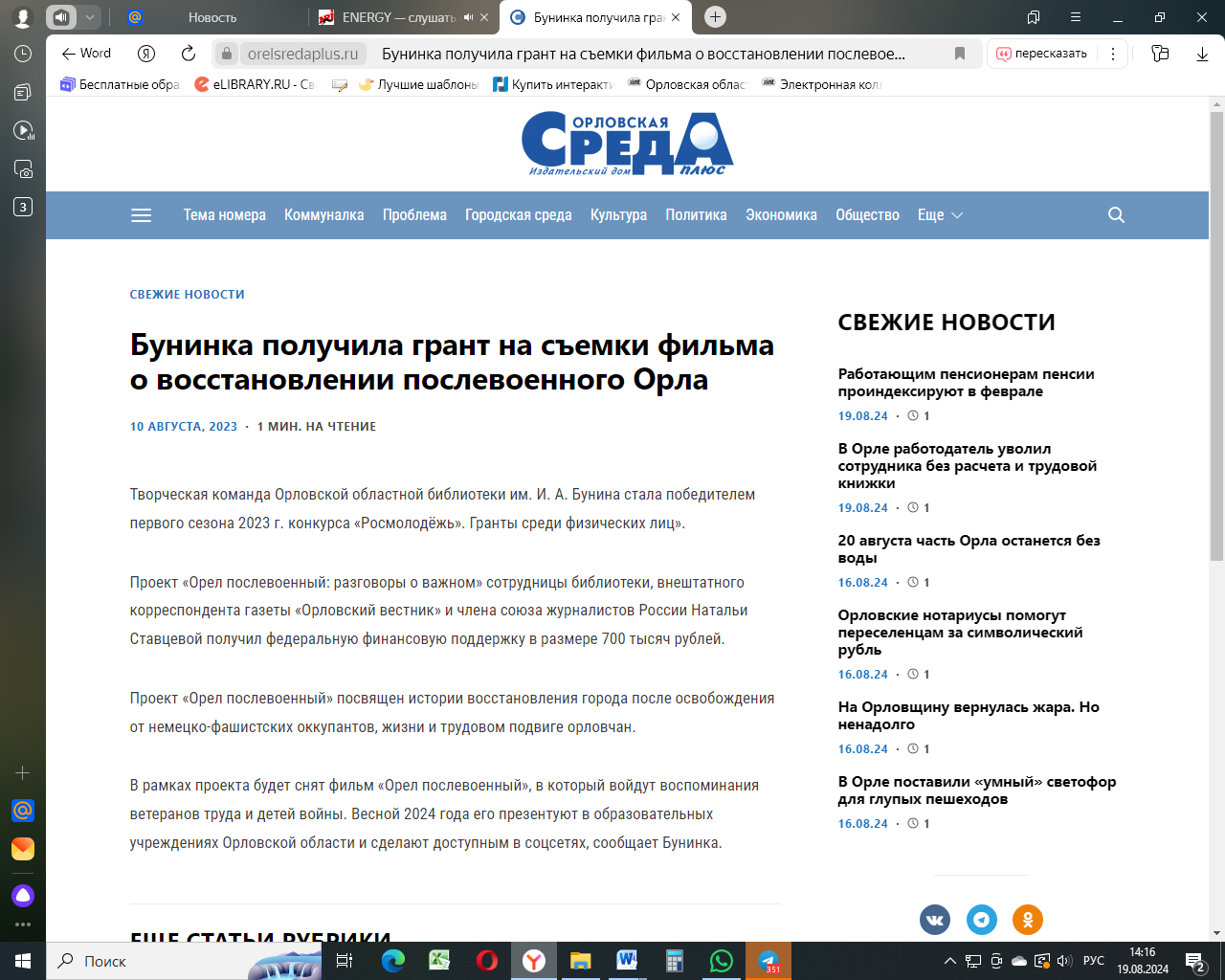 Бунинка получила грант на съемки фильма о восстановлении послевоенного Орла. – 10.08.2023. – Текст: электронный //