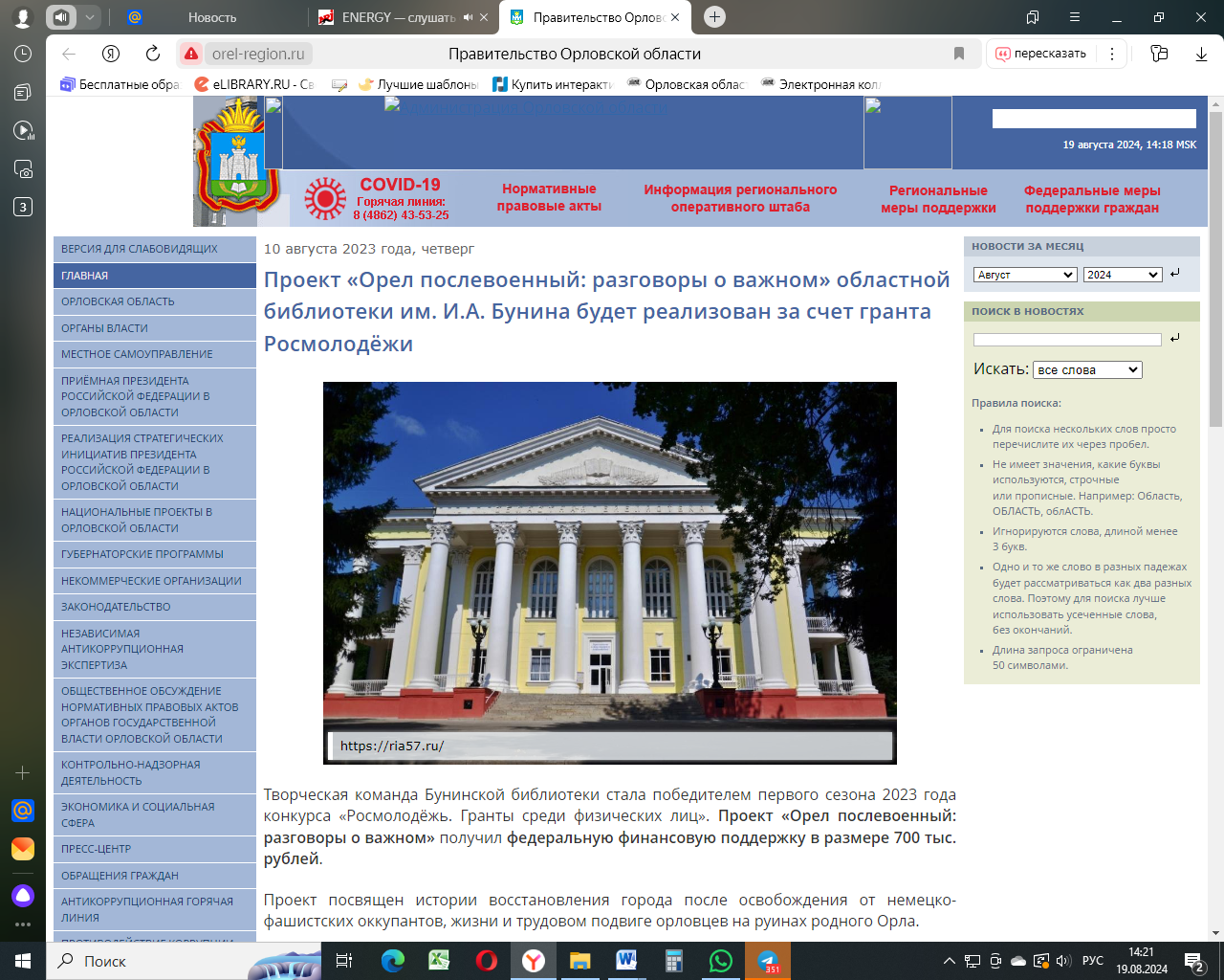 Проект «Орел послевоенный: разговоры о важном» областной библиотеки им. И.А. Бунина будет реализован за счет гранта Росмолодёжи. – 10.08.2023. – Текст: электронный //