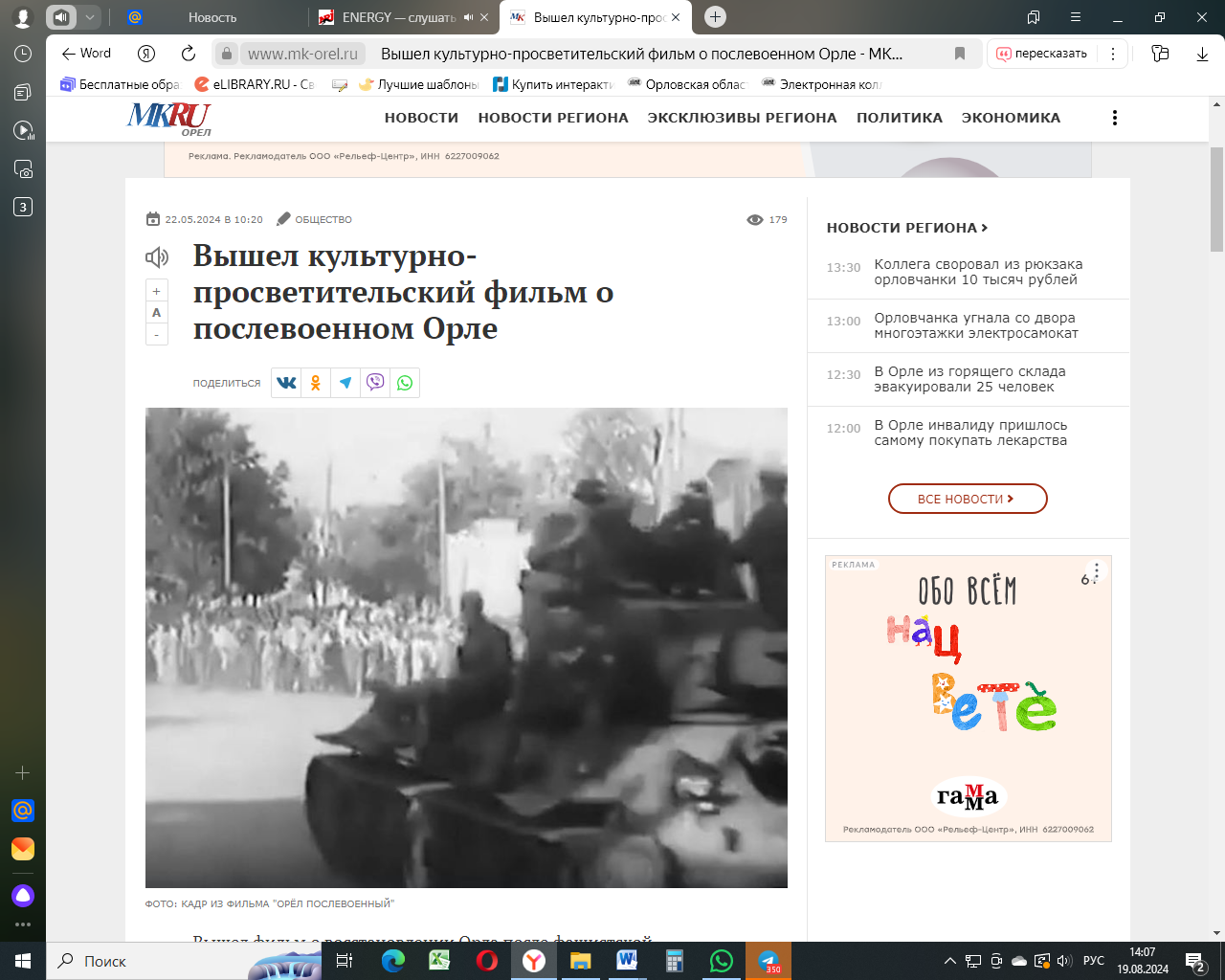 Вышел культурно-просветительский фильм о послевоенном Орле. – 22.05.2024. Текст: электронный //