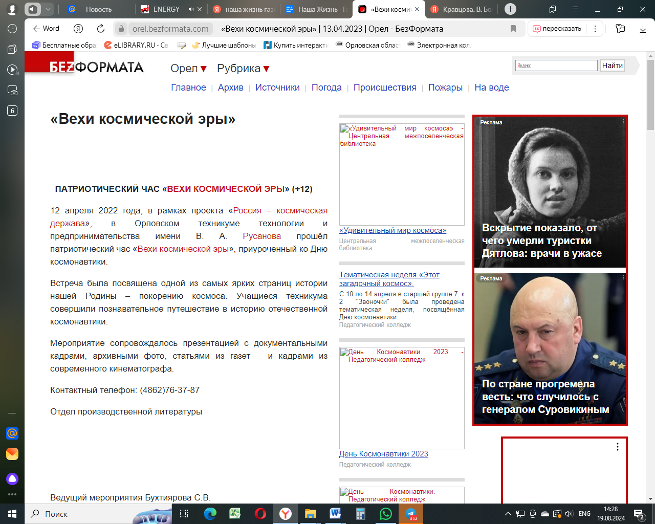 | Патриотический час «Вехи космической эры». – Текст: электронный // Беzфората. – 2023. 13 апреля (дата обращения 04.07.2024). |