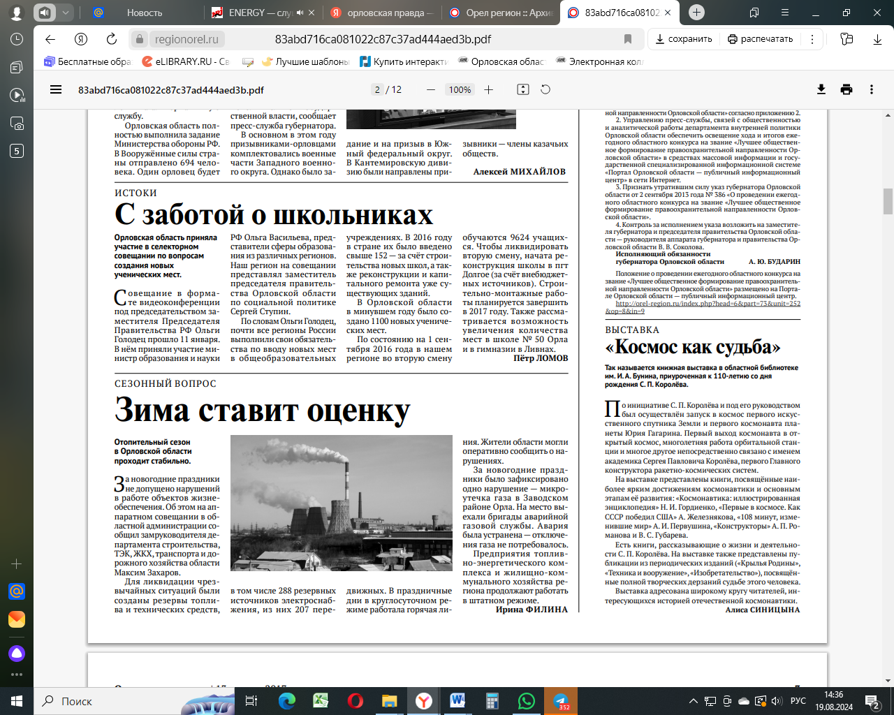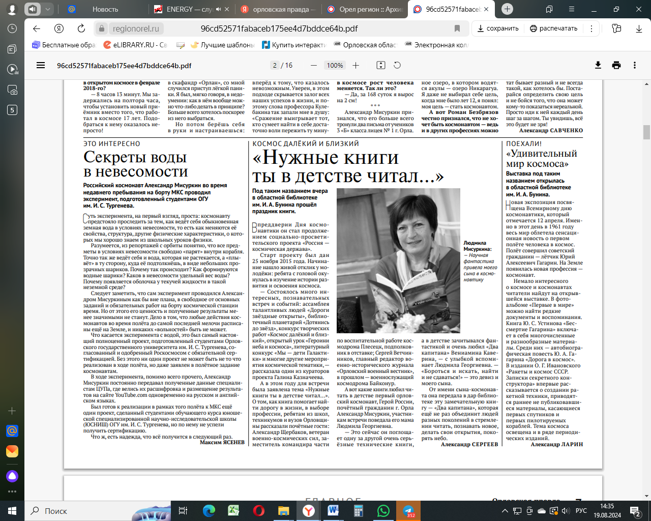 | Кравцова, В. Большое космическое путешествие / В. Кравцова // Наша жизнь (Орловский район).– 2021. – 9 апреля (13). – С. 1. Ларин, А. Удивительный мир космоса / А. Ларин // Орловская правда. – 2018. – 11 апреля (№ 39). – С. 2. | ||