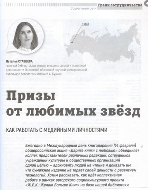 Ставцева Н. В.. Призы от любимых звезд: как работать с медийными личностями / Наталья Ставцева // Библиотека. – 2024. - № 10. – С. 51 54.