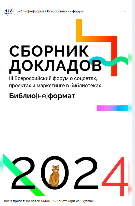 Ставцева Н. В. Международный день дарения книг: как сделать акцию интересной читателям, библиотекаря и медийным персонам / Наталья Викторовна Ставцева // Библио[не]формат: III Всероссийский онлайн-форум о соцсетях, проектах и маркетинге в библиотеках (1-2 августа, Якутск): сборник докладов. – Якутск, 2024. – С. 52 53.