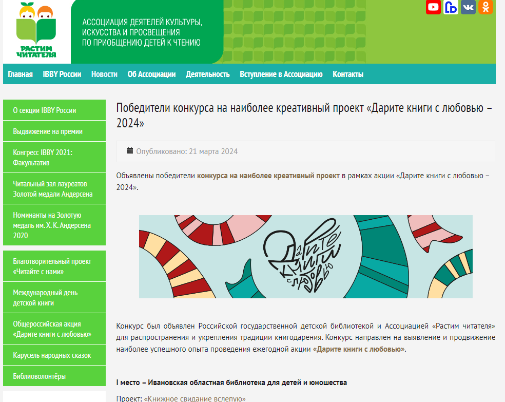 Победители конкурса на наиболее креативный проект «Дарите книги с любовью – 2024». – 21.03.2024. Текст: электронный // Ассоциация «Растим читателя» [сайт]: (дата обращения 02.12.2024).