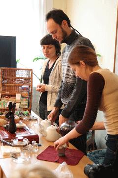 Мастера чайной церемонии Алексей и Ольга Бородины, артдиректор салона Наталия