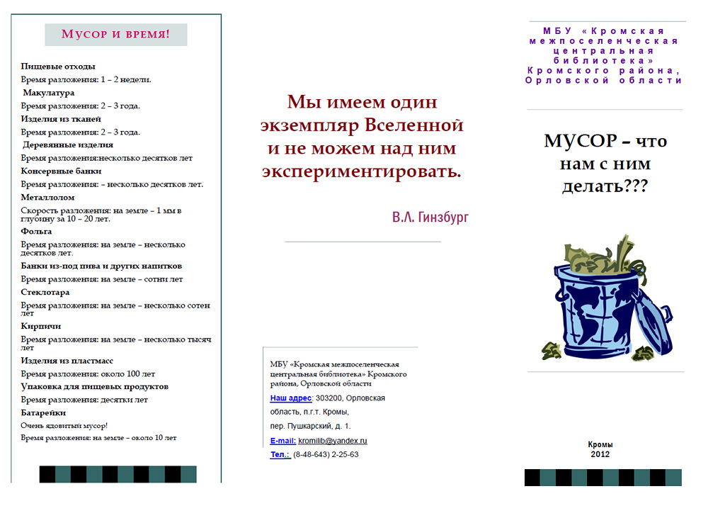 Библиотекам Орловской области отделом документов по экологии и сельскому хозяйству было разослано Положение о Конкурсе экологических буклетов, но приняла участие лишь Голубева Инна Геннадьевна – библиограф МБУ «Кромская межпоселенческая центральная библиотека» Кромского района, Орловской области, представив три буклета в трех номинациях: «Вода – ты самое большое богатство на свете!» (Номинация № 1: Проблема воды и рационального использования водных ресурсов); «Мусор – что нам с ним делать???» (Номинация № 4: Проблема мусора. Проблема отходов. Раздельный сбор мусора); «Химия в нашем доме!» (Номинация № 5: Химия в нашем доме. Грамотное использование химических препаратов).