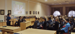 25 октября 2017 г. в областной библиотеке им. И.А. Бунина прошел экологический урок «Национальный парк «Орловское полесье»: изучение и сохранение экосистем», посвященный году экологии и особо охраняемых природных территорий России. Ведущая мероприятия – сотрудник отдела абонемента Н.М. Братчикова напомнила присутствующим о том, что такое особо охраняемые природные территории и, в виде красочной презентации рассказала о заповедниках и национальных парках России. О памятниках природы Орловской области учащиеся узнали из рассказа второго выступающего – кандидата биологических наук, доцента кафедры ботаники, физиологии и биохимии растений ОГУ им. И.С. Тургенева Л.Л. Киселевой. Используя видеоматериалы, Людмила Леонидовна поведала аудитории о заповедных местах орловской области и о проблемах, существующих в этой сфере. Наибольший интерес у присутствующих вызвало выступление Н.Ю. Валуевой – начальника отдела экологического просвещения и туризма ФГБУ «Национальный парк «Орловское полесье». Наталья Юрьевна рассказала об истории национального парка, основных направлениях деятельности и последних достижениях. Присутствующие по достоинству оценили документальный фильм «Зубры России: прошлое, настоящее, будущее», презентация которого состоялась летом 2017 г. Также ребята с удовольствием приняли участие в небольшой викторине, посвященной теме заповедников и национальных парков России. Все участники получили памятные сувениры от работников национального парка «Орловское полесье». Все присутствующие ознакомились с книжной выставкой «Есть в России такие места…», посвященной заповедным местам Орловской области и фотовыставкой о зубрах «Орловского полесья».