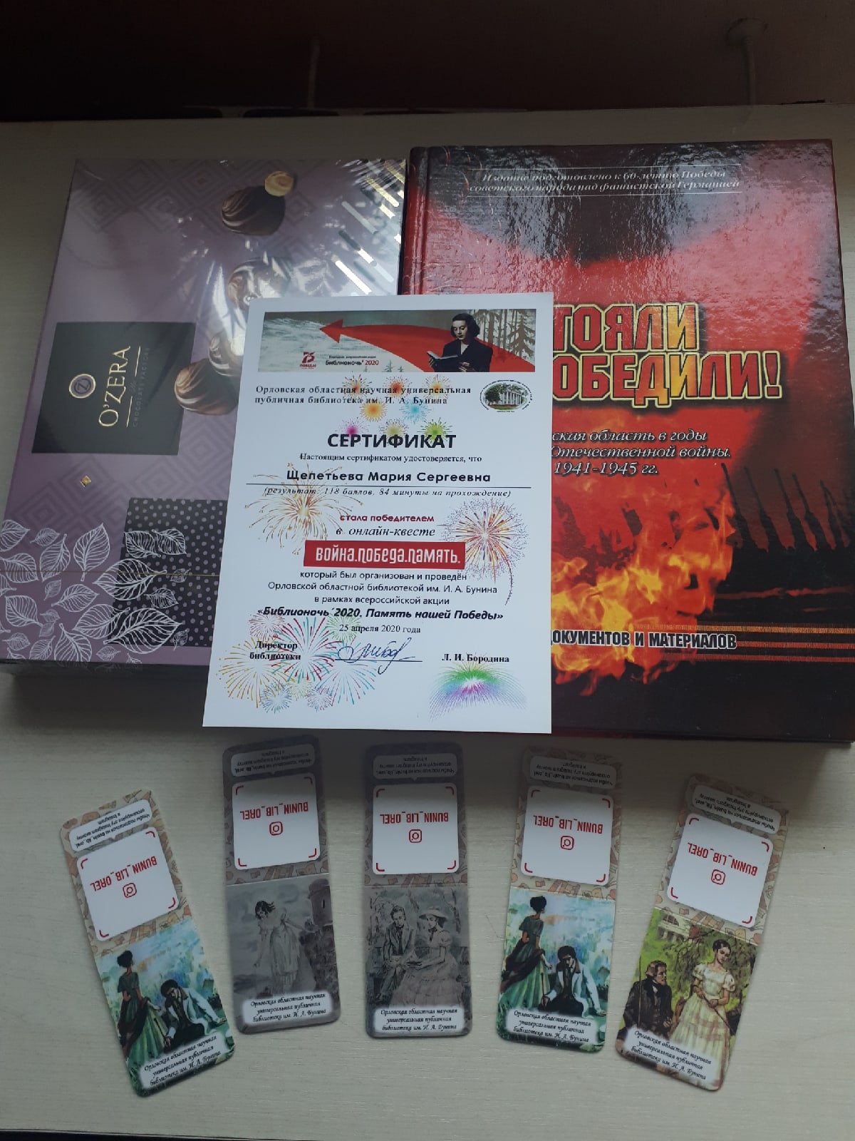 Все участники квеста получили электронные сертификаты. А главный приз уникальная книга о Великой Отечественной войне «Выстояли и победили. Орловская область в годы Великой Отечественной войны 1941-1945 гг.» уехала в Ростов-на-Дону.