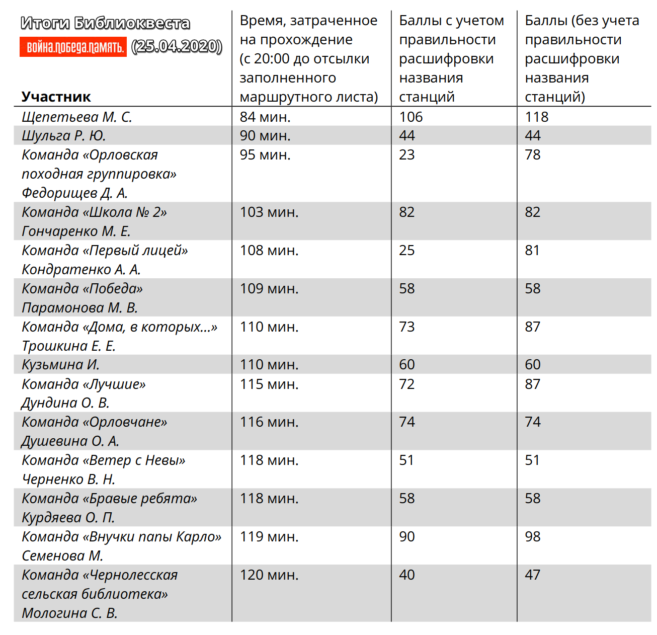 Библиоквест «Война. Победа. Память» 25 апреля 2020 года, в рамках социально-культурной акции «Библионочь-2020. Память нашей Победы», в Орловской областной научной универсальной публичной библиотеке им. И. А. Бунина состоялся библиоквест «Война. Победа. Память». Впервые мероприятие проходило в формате онлайн. Новый формат квеста позволил играть не только командам, но и индивидуальным участникам, даже тем, кто находился далеко от библиотеки и далеко от Орла. Игра проходила на официальном сайте библиотеки. Раздел сайта «Структура» был специально «модернизирован» для игры. А все зарегистрировавшиеся участники получили подробные инструкции. Квест состоял из 15 станций (отделов библиотеки) названия, которых зашифрованы. На каждой станции участники выполняли определенные задания, а правильные ответы записывали в маршрутный лист, который по окончании игры прислали нам. Всего было подано 20 заявок. До финала дошли 14. Победителем стала Щепетьева Мария Сергеевна из города Ростов-на-Дону. Полные результаты отражены в таблице: