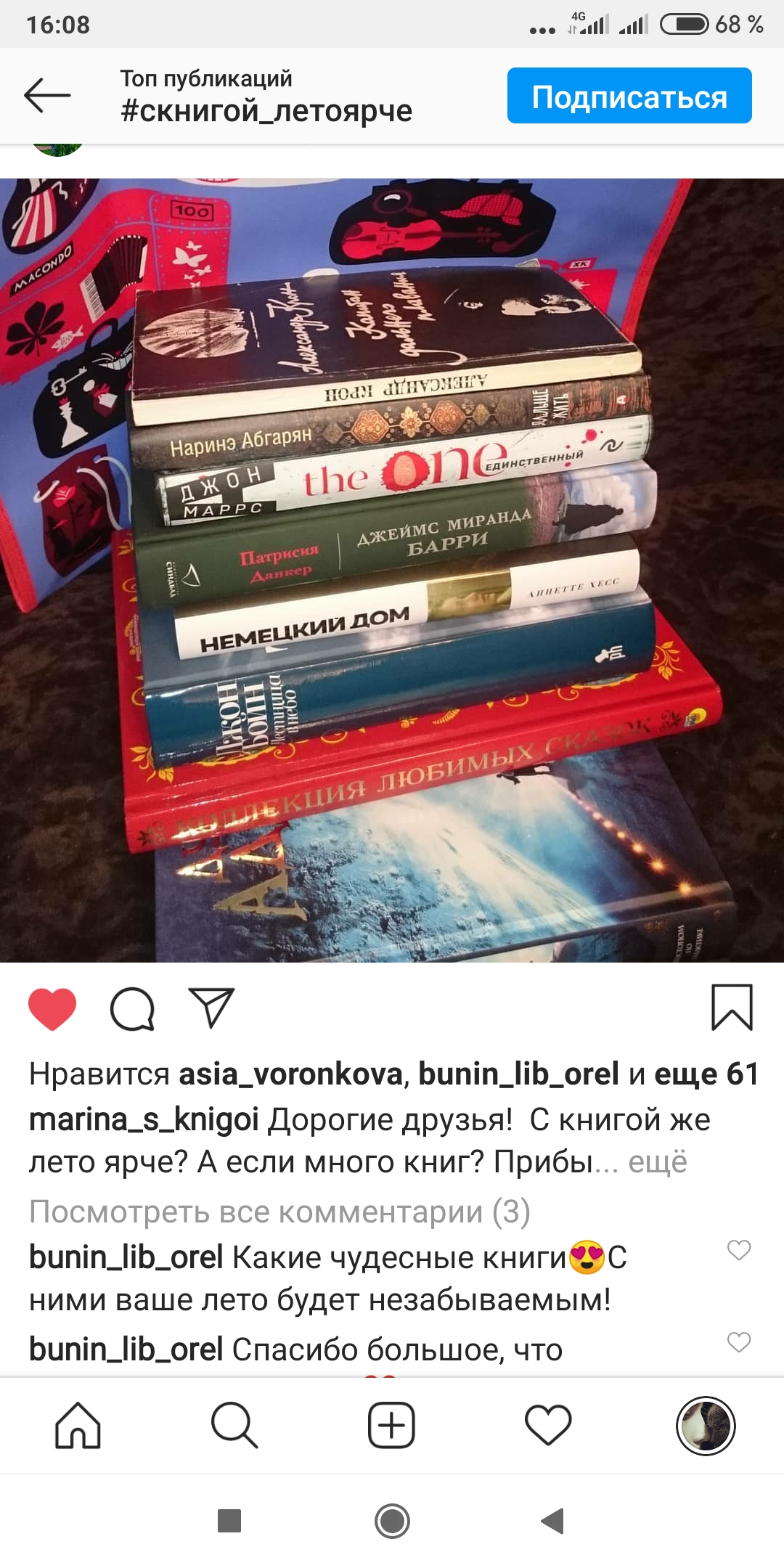 Книжный сетевой марафон «#СКнигой_ЛетоЯрче» (12+) Подведены итоги сетевого книжного марафона «#СКнигой_ЛетоЯрче», который был запущен в аккаунте библиотеки в Instagram (экстремистская организация, запрещенная в России) (@bunin_lib_orel). Марафон проходил с 1 июня по 31 августа 2020 г. В течение трех месяцев участники марафона читали интересные книги, писали отзывы, делали фотографии или видео книги, и публиковали их в Инстаграм (экстремистская организация, запрещенная в России) .