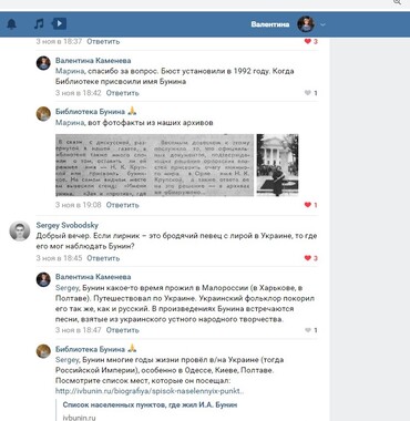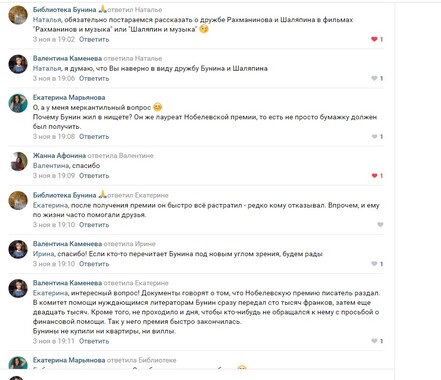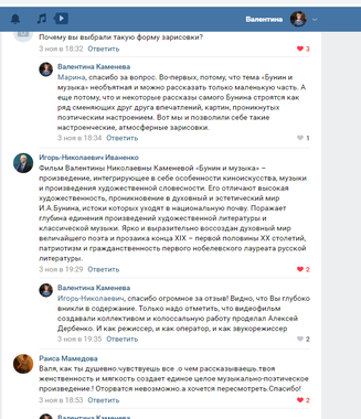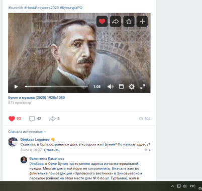 Обсуждение видеофильма «Бунин и музыка» 3 ноября 2020 года в рамках Всероссийской акции «Ночь искусств – 2020» на странице Библиотеки Бунина в социальной сети «Вконтакте» состоялся онлайн-показ и обсуждение мультимедийного издания Орловской областной библиотеки «Бунин и музыка» (https://vk.com/bunin_lib?w=wall147656091_8032). Видеофильм приурочен к 150-летию писателя. Просмотр собрал большую зрительскую аудиторию, причем достаточно неравнодушную. Это подтверждают вопросы, которые активно задавались в комментариях к фильму и посту. Вопросы задавали про отдельные подробности биографии писателя, связанные с Орлом: по какому адресу писатель жил в Орле, о бюсте Бунина перед нашей Библиотекой. Проявили интерес и к периоду его жизни в эмиграции. В частности, любопытство вызвала причина, по которой Бунин бедствовал уже после получения Нобелевской премии. Не обошли вниманием и тему взаимоотношений Бунина и Рахманинова, «поставили на вид» авторам, что не упомянули о дружбе писателя с Шаляпиным. Спрашивали зрители и о том, что осталось за рамками работы, будут ли новые «серии» медиаиздания, как можно взять в библиотеке нотные издания произведений на слова Бунина. Много добрых слов было сказано в адрес творческого коллектива «Бунинки». Зрители подчеркнули, что фильм «тонко передает настроение рассказов и стихотворений И. А. Бунина», отметили «подборку картин, стихов, музыки, яркое комментирование, доступный и понятный материал», «проникновение в духовный и эстетический мир писателя», а главное, тот факт, что фильм «можно прекрасно использовать в работе». Кто-то писал в комментарии, что открыл для себя Бунина «по-новому», а для кого-то он «стал импульсом» к тому, чтобы перечитать его прозу и поэзию. И именно это лучшая награда для создателей фильма! И неравнодушные зрители, и авторы получили удовольствие от взаимного общения.