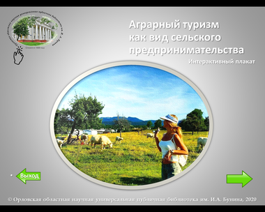Интерактивный плакат «Аграрный туризм как вид сельского предпринимательства» (12+) Отдел документов по экологии и сельскому хозяйству подготовил интерактивный плакат «Аграрный туризм как вид сельского предпринимательства». С каждым годом в мире и в России набирает популярность такой вид путешествий, как аграрный (сельский) туризм. Для путешественников это способ совершить интересную поездку, подышать свежим воздухом, отдохнуть от городского шума, познакомиться с местными традициями и промыслами, научиться готовить блюда местной кухни, увезти с собой множество воспоминаний и сувениров. Для деревенских жителей сельский туризм – это возможность разнообразить источники дохода, создать альтернативные рабочие места (в том числе для молодежи и пенсионеров) и, что немаловажно, открыть и развить в себе творческий потенциал. Плакат рассказывает, что такое агротуризм, его виды и как на нем можно заработать. Кроме того, для желающих заняться агротуризмом, даются ссылки на методические пособия по организации бизнеса. Книги содержат описание методики (этапов) развития сельского туризма на территории: как выстроить взаимоотношения между структурами власти и населением, как организовать обучение и стажировки, зачем нужна финансовая поддержка сельских инициатив и пр. На примерах практического опыта успешных проектов в книгах рассказано: кто и как развивает сельский туризм в разных регионах страны, кто может заниматься таким развитием. Для тех, кто устал от шума и желает на некоторое время сменить постоянную суету и спешку на спокойный и размеренный образ жизни, предлагаются адреса гостевых домов, туристических баз Орловской области, где можно накормить лошадь сеном, подоить корову, полюбоваться на игривых козлят, сходить в лес, попариться в бане, чтобы получить необыкновенный заряд бодрости и здоровья. Познакомиться с интерактивным плакатом можно на сайте Областной библиотеки им. И.А. Бунина по ссылке.