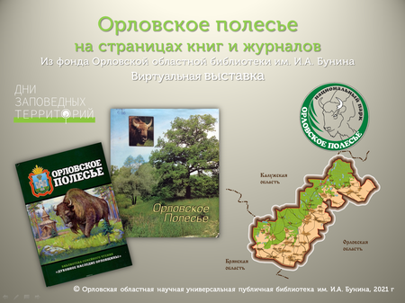 Виртуальная выставка «Орловское Полесье» на страницах книг и журналов. Из фонда Орловской областной библиотеки им. И.А. Бунина» (12+) Отдел документов по экологии и сельскому хозяйству подготовил виртуальную выставку «Орловское Полесье» на страницах книг и журналов. Из фонда Орловской областной библиотеки им. И.А. Бунина». Познакомиться с национальным парком, конечно, лучше посетив его, а если нет такой возможности? Тогда на помощь приходят наши неизменные друзья – книги. На выставке представлены книги, повествующие об истории заповедника, его природе, флоре и фауне, научной деятельности сотрудников НП и туристических маршрутах. Прекрасно оформленные, иллюстрированные справочники и путеводители помогут легко ориентироваться на территории парка, монографии, сборники научных трудов, посвященные проблемам сохранения и восстановления диких копытных животных, в основном зубра европейского, расскажут о научной деятельности сотрудников парка. Издания, представленные на выставке, в основном, ориентированы на широкий круг туристов, желающих посетить парк, как для отдыха, так и для знакомства с природными и культурными особенностями, но и для специалистов по охране природы, учащимся и преподавателям будут полезны многие книги. Со всеми названными изданиями и многими другими можно познакомиться в отделе документов по экологии и сельскому хозяйству и отделе краеведческих документов библиотеки, а самой выставкой на сайте Орловской областной библиотеки им. И.А. Бунина. Ссылка на Виртуальную выставку в PDF