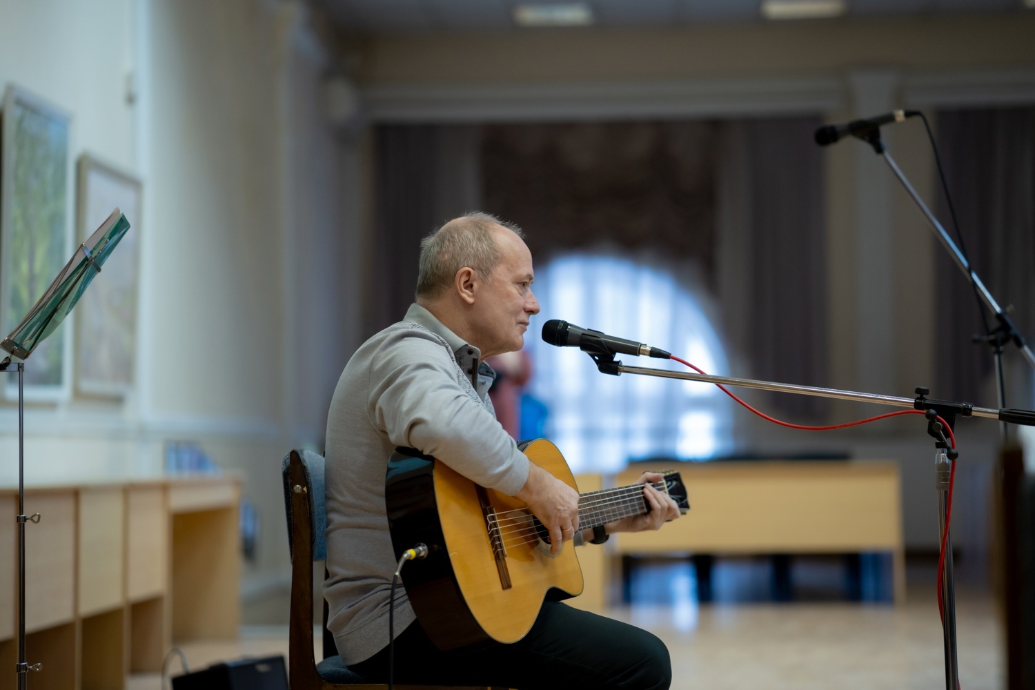 Д. Сивов завораживает флейтой Первый блок концертной программы состоял из выступлений участников Орловского клуба авторской песни, которые давно сотрудничают с хоровым ансамблем, и пришли поддержать творческий коллектив. И. Петренко и С. Востриков под гитару исполнили лирические и трогательные авторские сочинения.