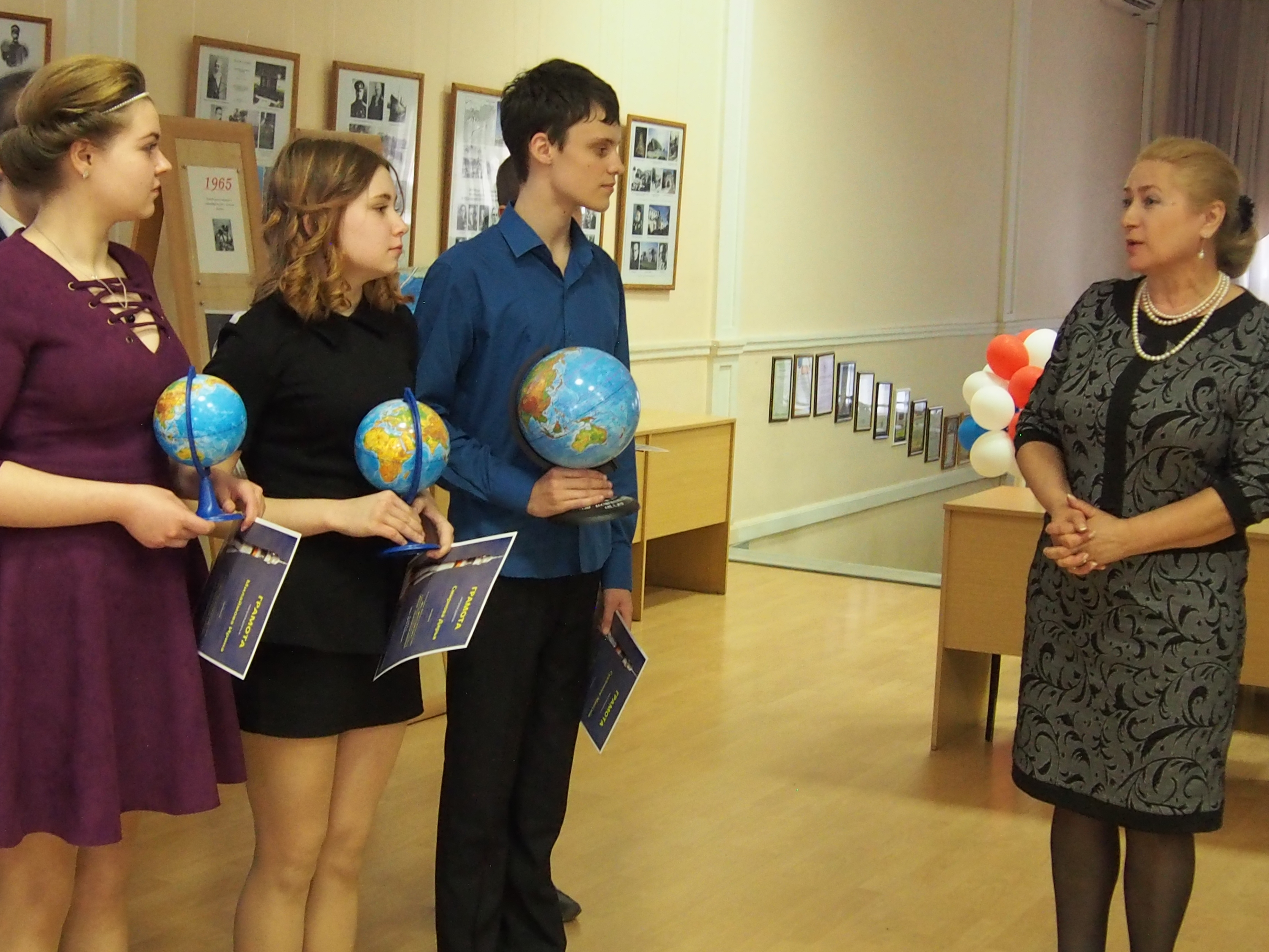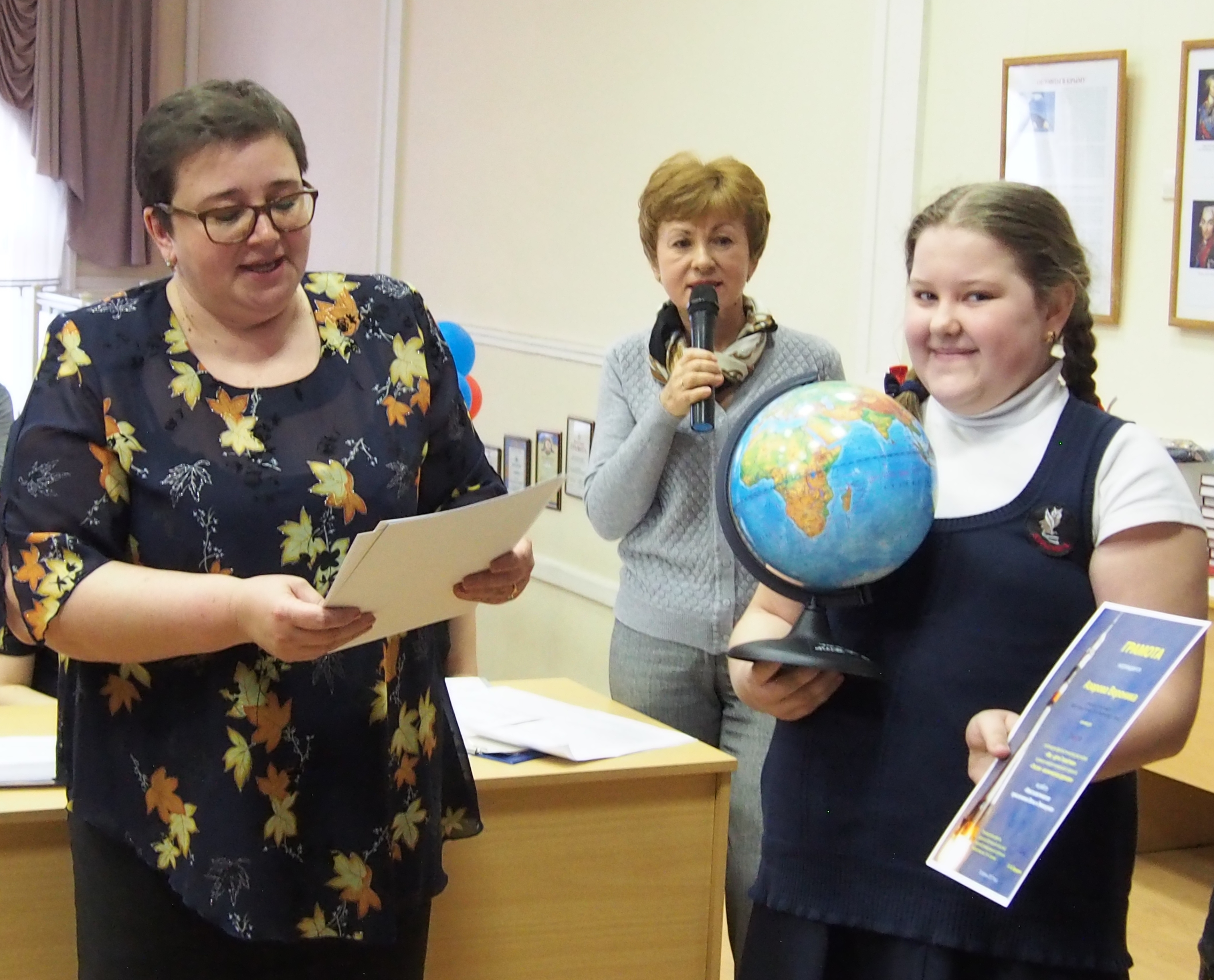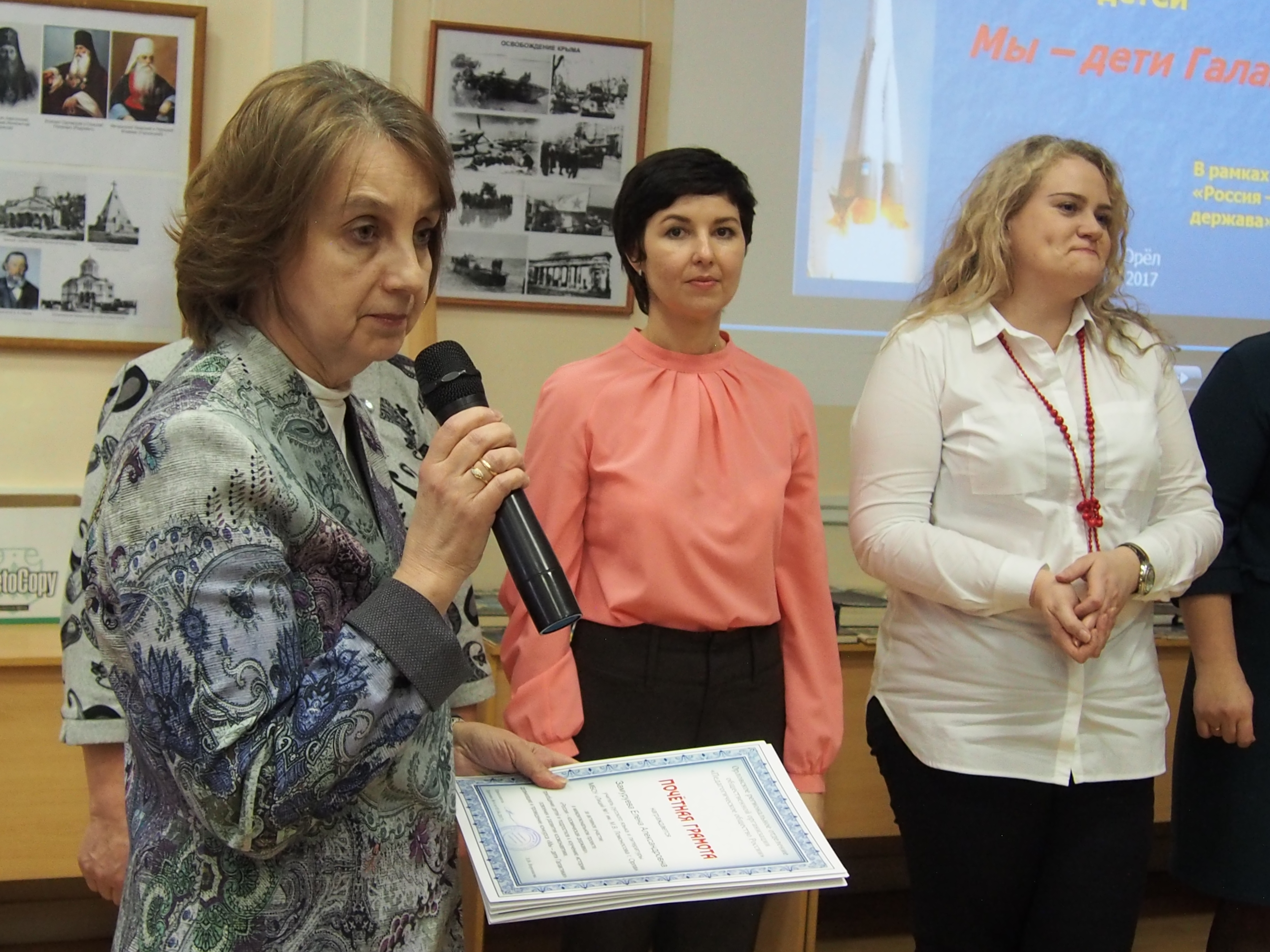 Церемония награждения победителей конкурса фантастических рассказов «Мы – дети Галактики». Слева направо: директор Орловской областной библиотеки им. И. А. Бунина Бородина Людмила Ивановна; ученый секретарь Орловской областной библиотеки им. И. А. Бунина, кандидат политических наук Казначеева Галина Анатольевна; победительница конкурса Азарова Вероника