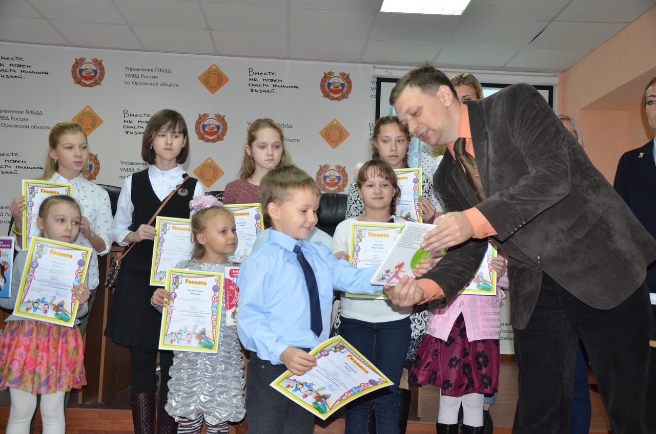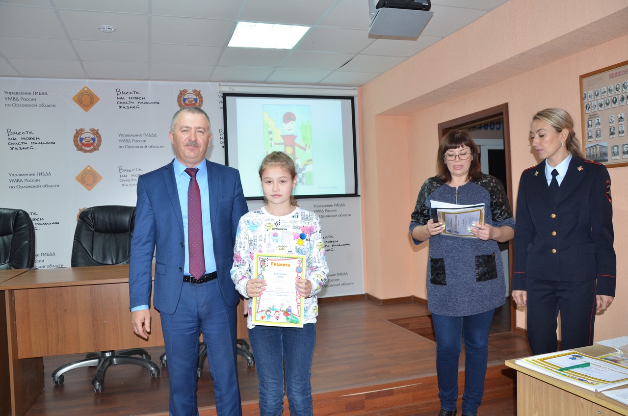 Церемония награждения участников конкурса «Я рисую безопасность своего города». Грамоты вручают партнеры проекта «Безопасность дорожного движения»: Коршунов Александр Юрьевич – начальник УГИБДД УМВД России по Орловской области, полковник полиции; Дудина Наталья Александровна – старший инспектор по пропаганде УГИБДД УМВД России по Орловской области