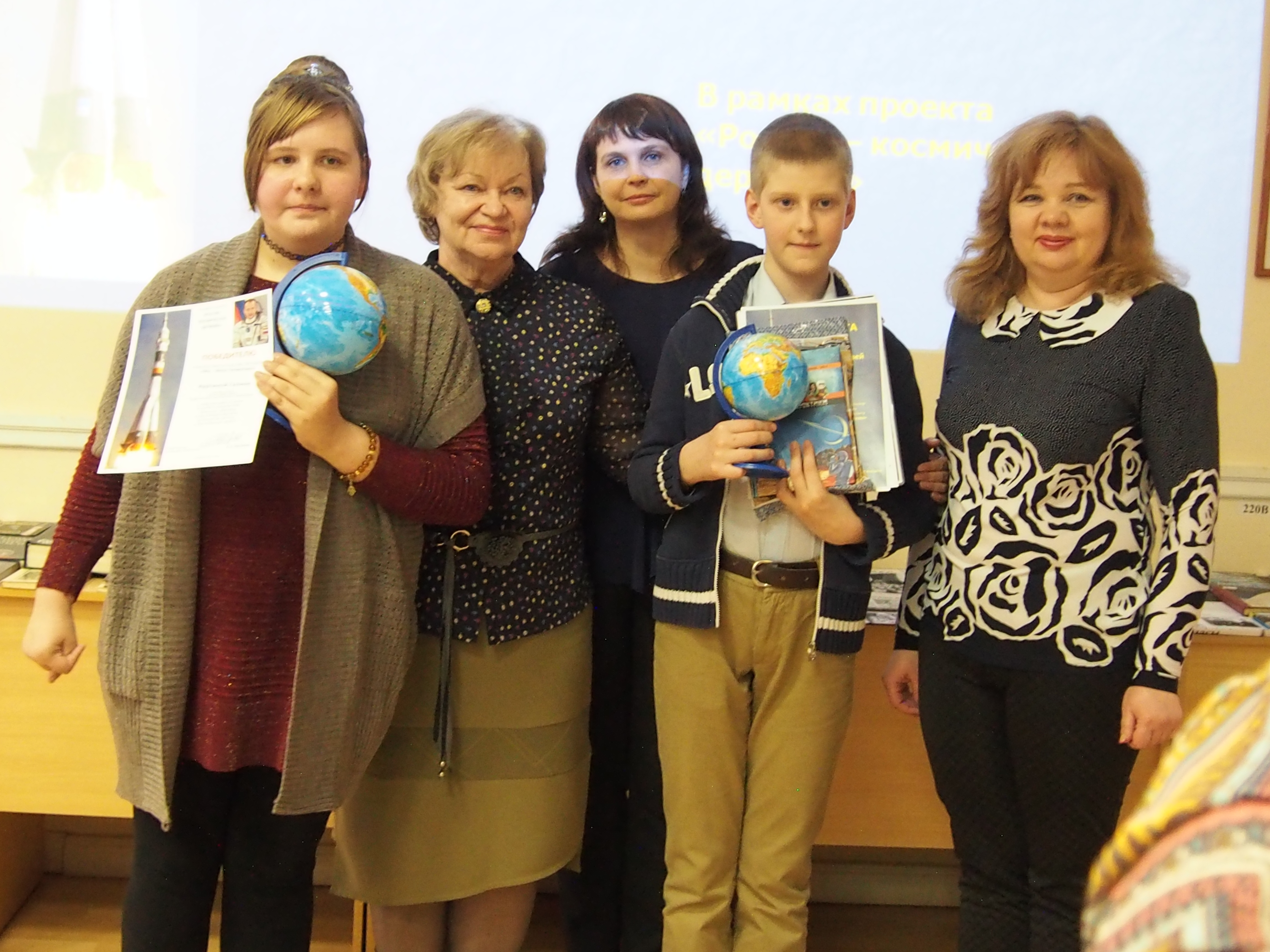 Учащиеся Ресурсного центра дистанционного образования Орловского регионального центра психолого-педагогической, медицинской и социальной помощи – участники конкурса фантастических рассказов «Мы – дети Галактики». Слева направо: руководитель центра Пилюгина Нина Анатольевна, заведующая отделом производственно-технических документов Орловской областной библиотеки им. И. А. Бунина – Бухтиярова С. В., социальный педагог центра – Чернякова Оксана Анатольевна