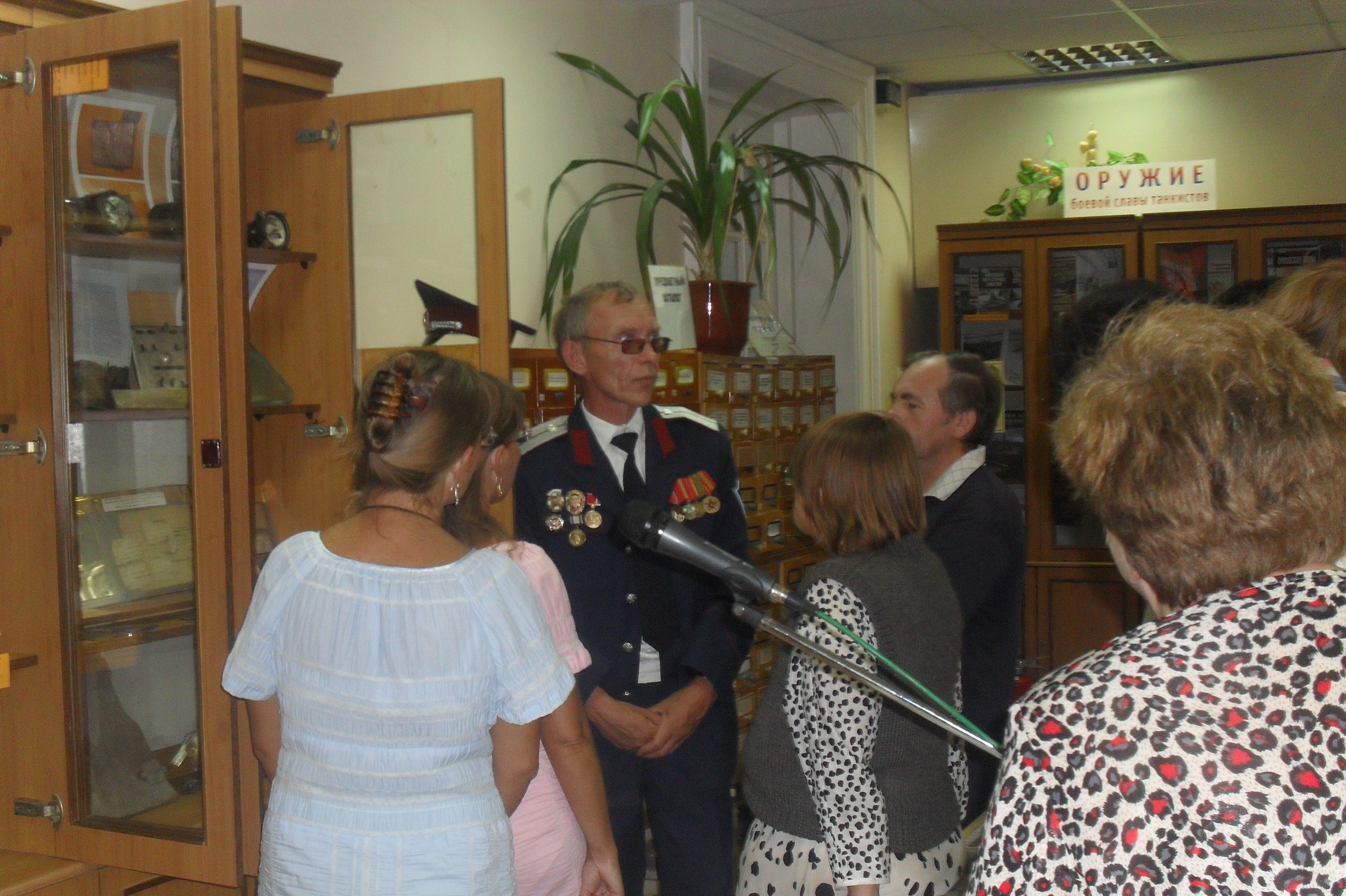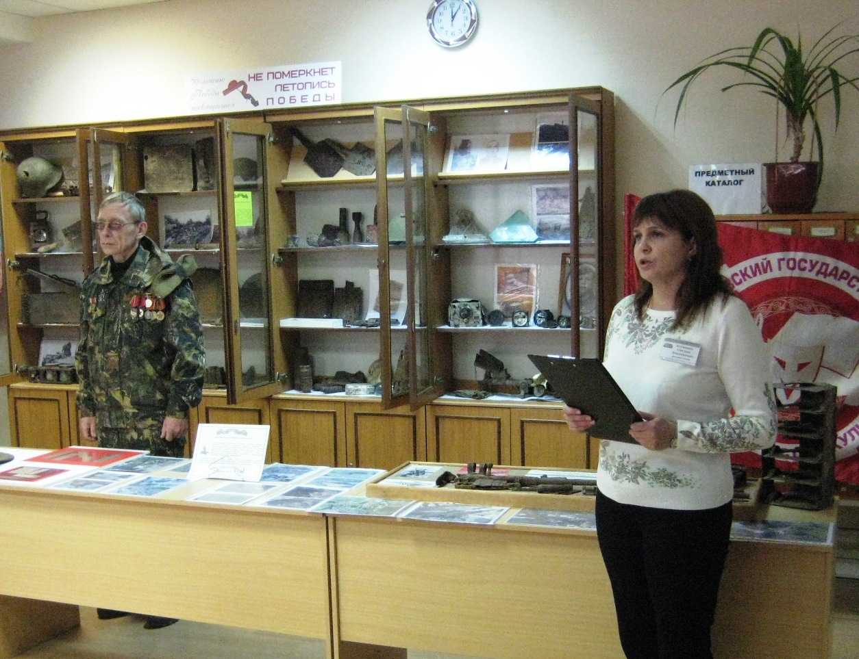 Патриотический час, посвященный деятельности Молодежного общественного объединения «Огненная дуга». На снимке Андреев Николай Анатольевич – директор музея Орловского филиала Российской Академии народного хозяйства и Государственной службы при президенте РФ (РАНХиГС), председатель Молодежного общественного поискового объединения «Огненная Дуга». Выступает Бухтиярова С. В. – заведующая отделом производственно-технических документов Орловской областной библиотеки им. И. А. Бунина