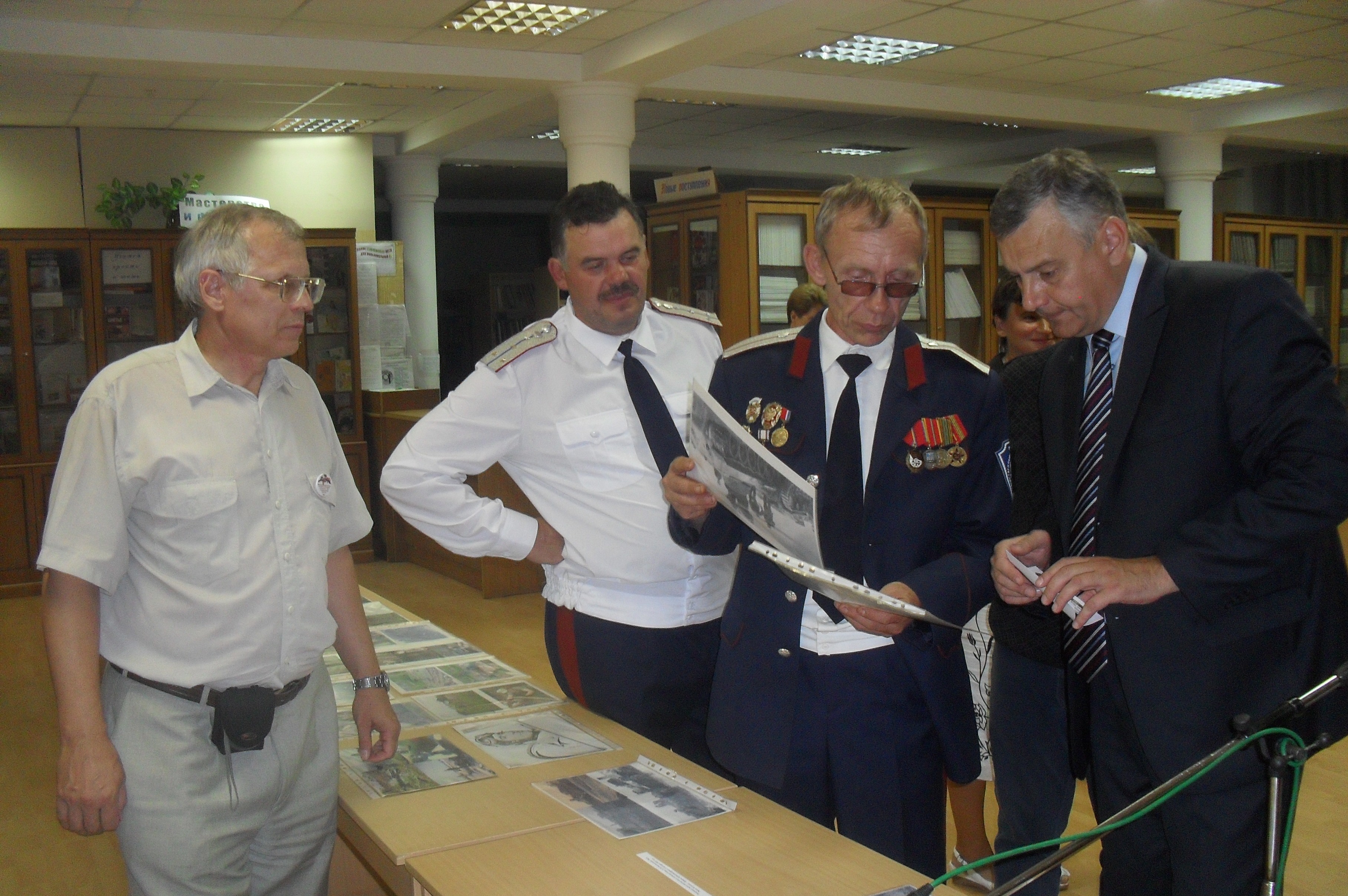 Участники социально-культурной акции «Ночь в библиотеке», посвященной 70-летию освобождения г.Орла и Орловской области от фашистских захватчиков. Слева направо: – Невров С. А., руководитель Орловской кадетской школы при Доме творчества Заводского района г.Орла, атаман Орловского городского казачьего общества войскового казачьего общества «Центральное казачье войско» (ОГКО ВКО «ЦКВ»); Щекотихин Е. Е., доктор исторических наук; Андреев Н. А., директор музея Орловского филиала Российской Академии народного хозяйства и Государственной службы при президенте РФ (РАНХиГС), председатель Молодежного общественного поискового объединения «Огненная Дуга»