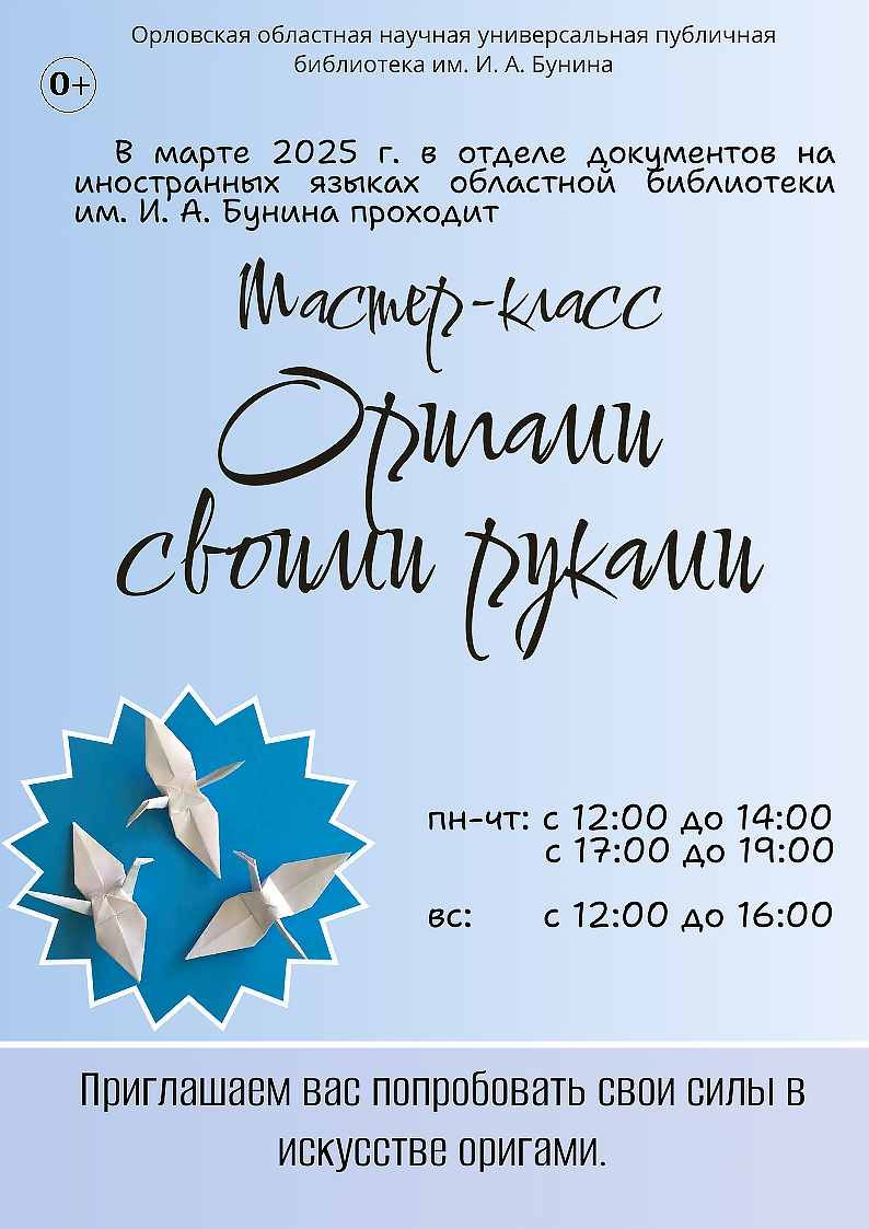 С 1 по 30 апреля 2025 года в отделе документов на иностранных языках Орловской областной библиотеки им. И. А. Бунина проходит мастер-класс «Оригами своими руками».