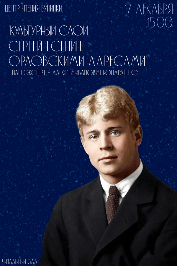 17 декабря 2025 года в 15:00 в читальном зале Орловской областной библиотеки им. И, А. Бунина состоится встреча в рамках проекта-полилога «Культурный слой» под названием – «Сергей Есенин: орловскими адресами».
