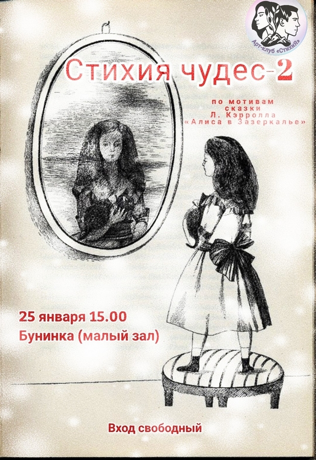 25 января в 15:00 в Орловской областной библиотеке им. И. А. Бунина пройдет новое заседание арт-клуба «СтихиЯ» под названием «Стихия чудес - 2», по мотивам сказки Льюиса Кэрролла «Алиса в Зазеркалье». С наступлением января, когда природа укутывается в белоснежное покрывало, а дороги превращаются в сверкающие зеркала, самое время погрузиться в волшебное безумие зимних чудес.